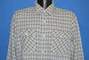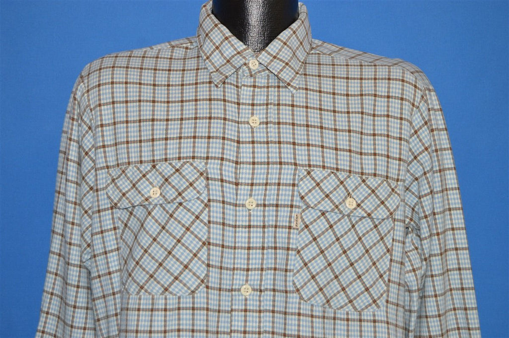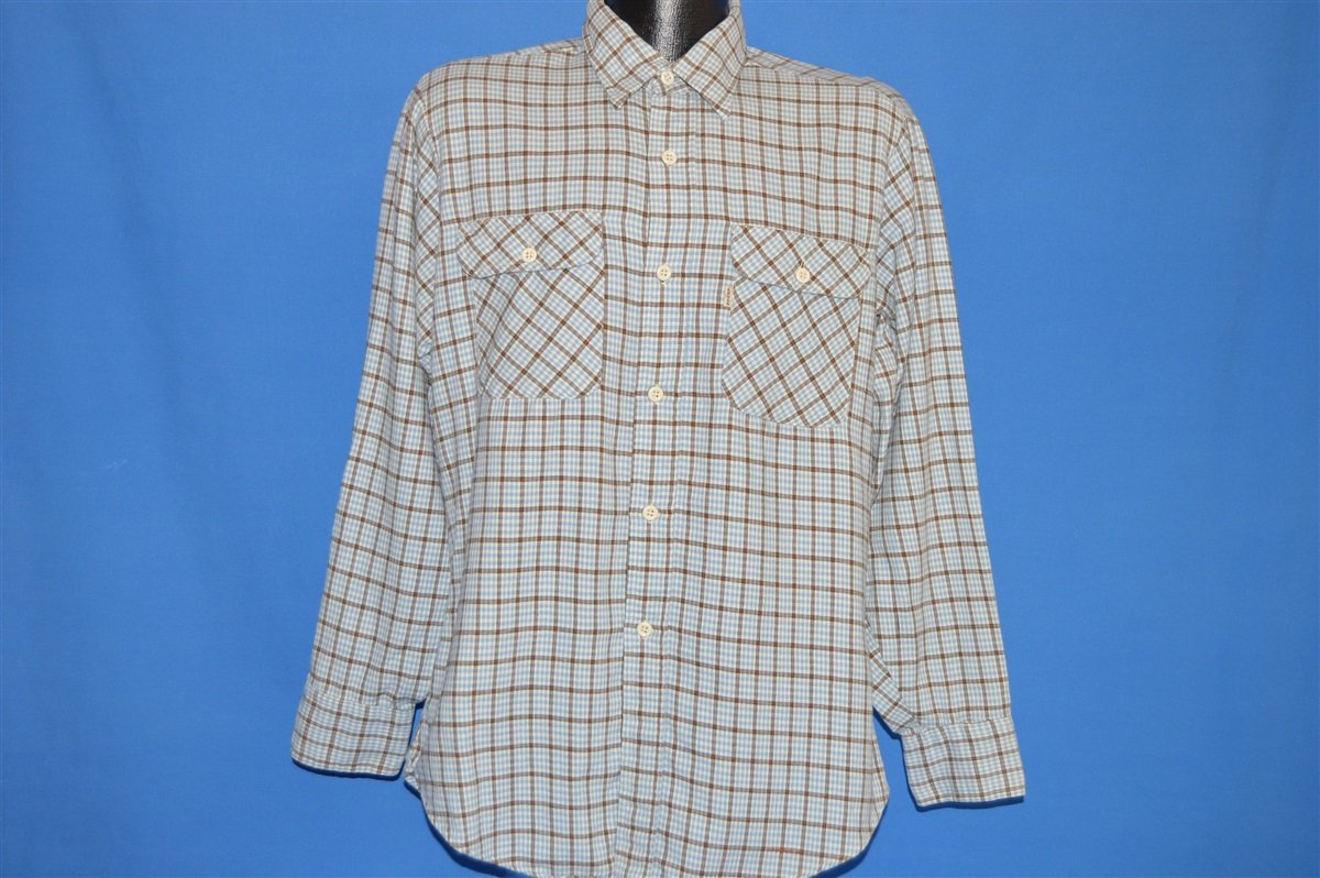 This brown and blue plaid vintage shirt is a button down. The shirt has long sleeves and two chest pockets.The shirt is made from a heavy flannel material.