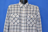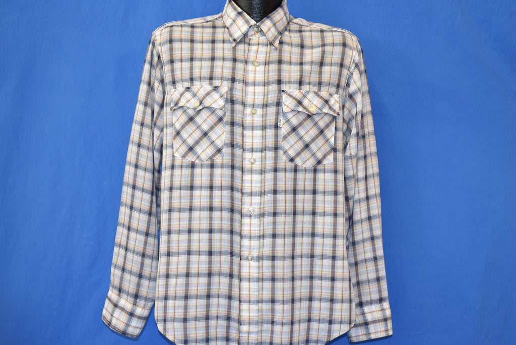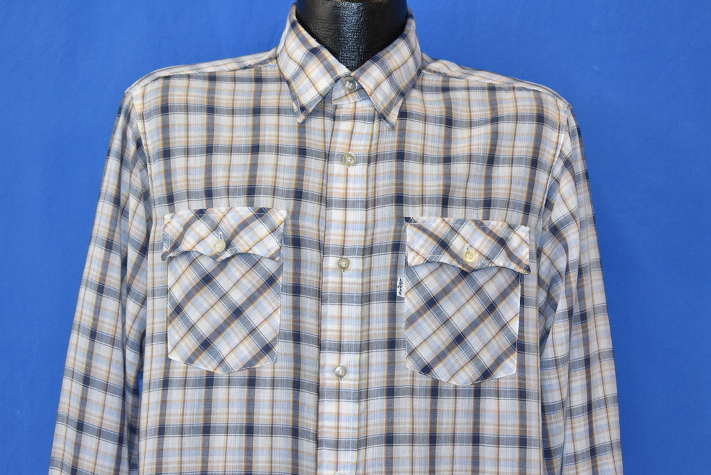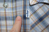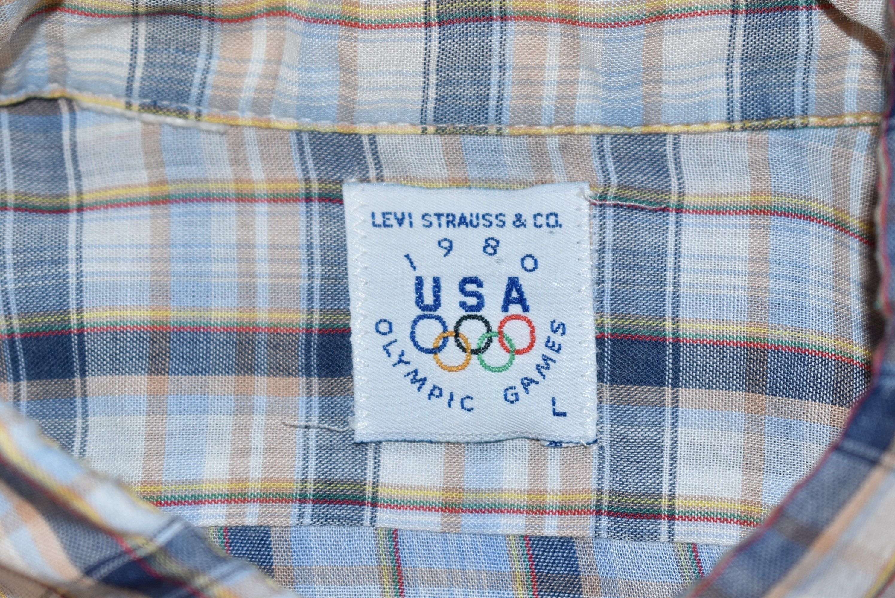 This plaid shirt is from the brand Levi's in the 1980s. It features an all-over white, blue, and beige plaid print with two western-style button flap pockets and a Levi's white tab on the left pocket. The tag says that the shirt is from the 1980 USA Olympic Games. The 1980 Winter Olympics, officially known as the XIII Olympic Winter Games, were held in Lake Placid, New York. Levi's was a sponsor of the USA Olympic team and outfitted their athletes in these plaid shirts.