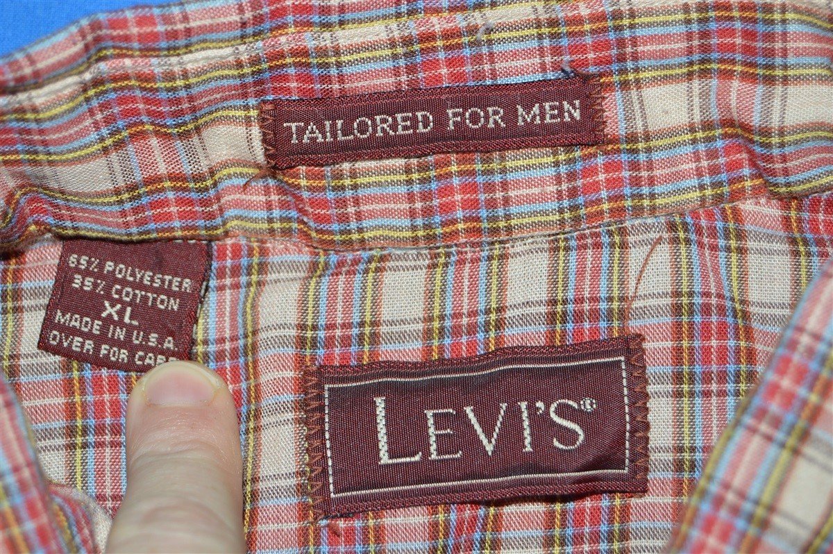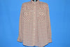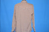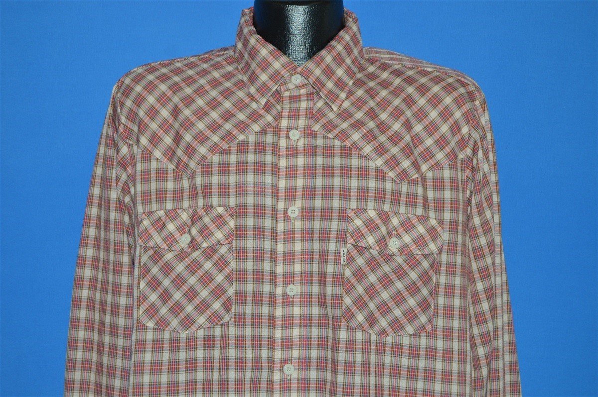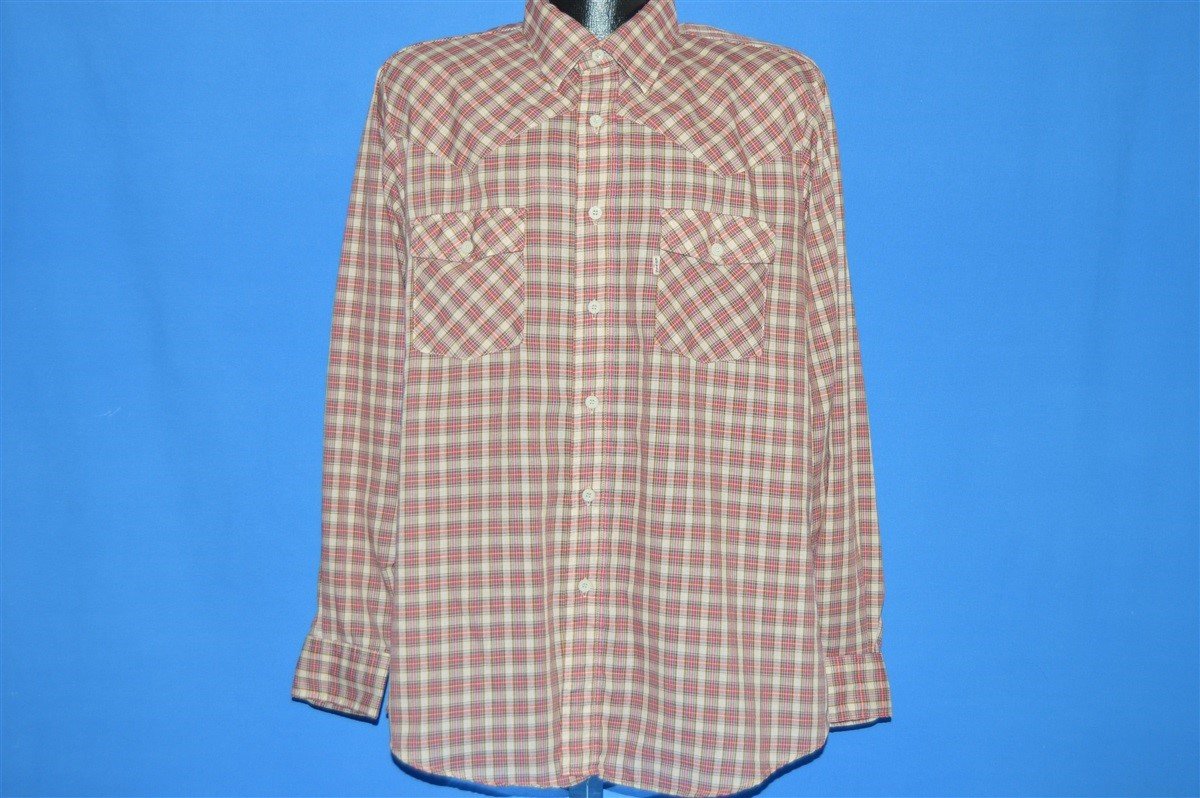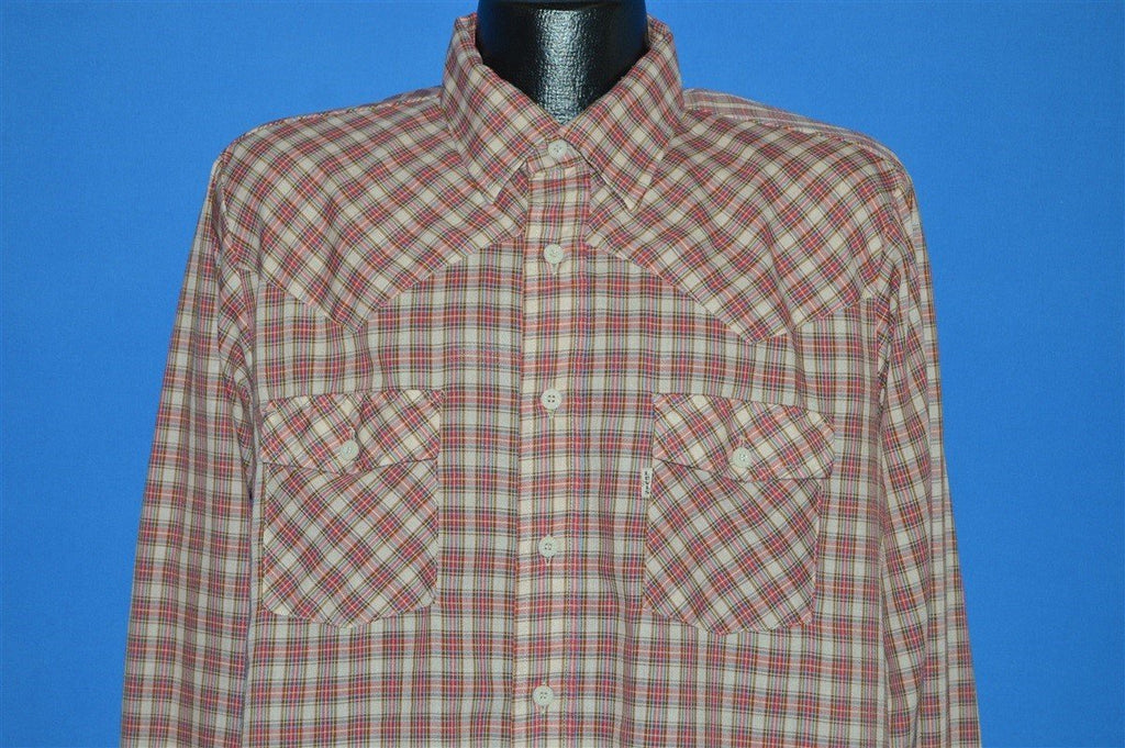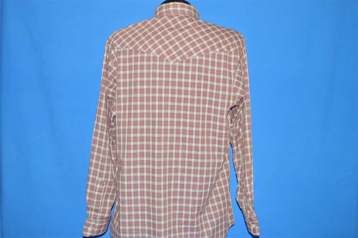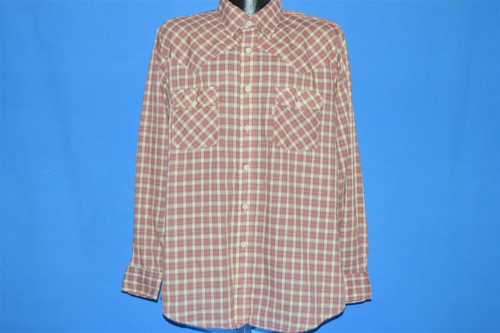 This vintage men's shirt has a red and gray plaid pattern. The western style shirt is a button down with long sleeves.