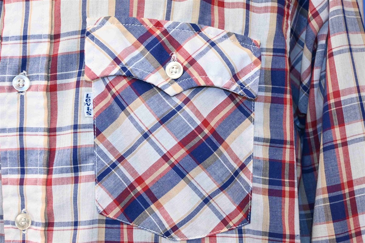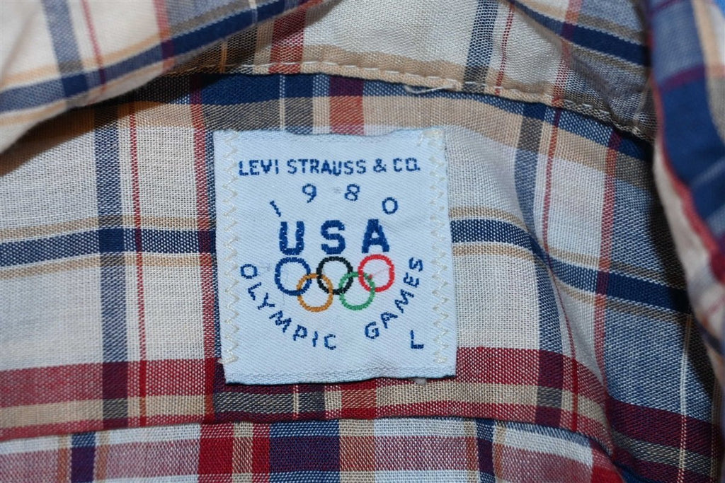 This handsome vintage button down was made by Levi's in honor of the 1980 Olympic Games. Levi's was originally slated to be one of the many Olympic sponsors for team USA, until the US decided to boycott the games in opposition of the Soviet-Afghan War. This shirt is one of the many promotional items that still remain, and it features a red, white, and blue plaid pattern and two button flapped chest pockets.