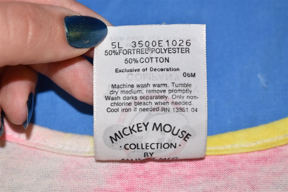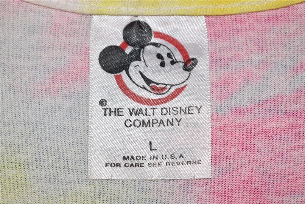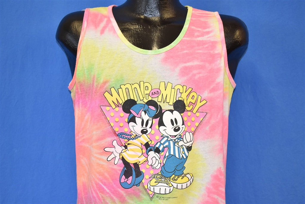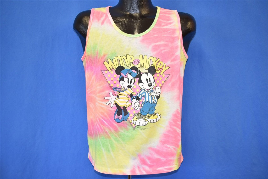 This 80s tie dye tank top features the adorable Disney cartoon duo Minnie and Mickey. The animated couple is dressed in 80s style clothing. Minnie in a striped dress, a large beaded necklace, and a headband. Mickey has on a striped button-up shirt, rolled up jeans, and sneakers.