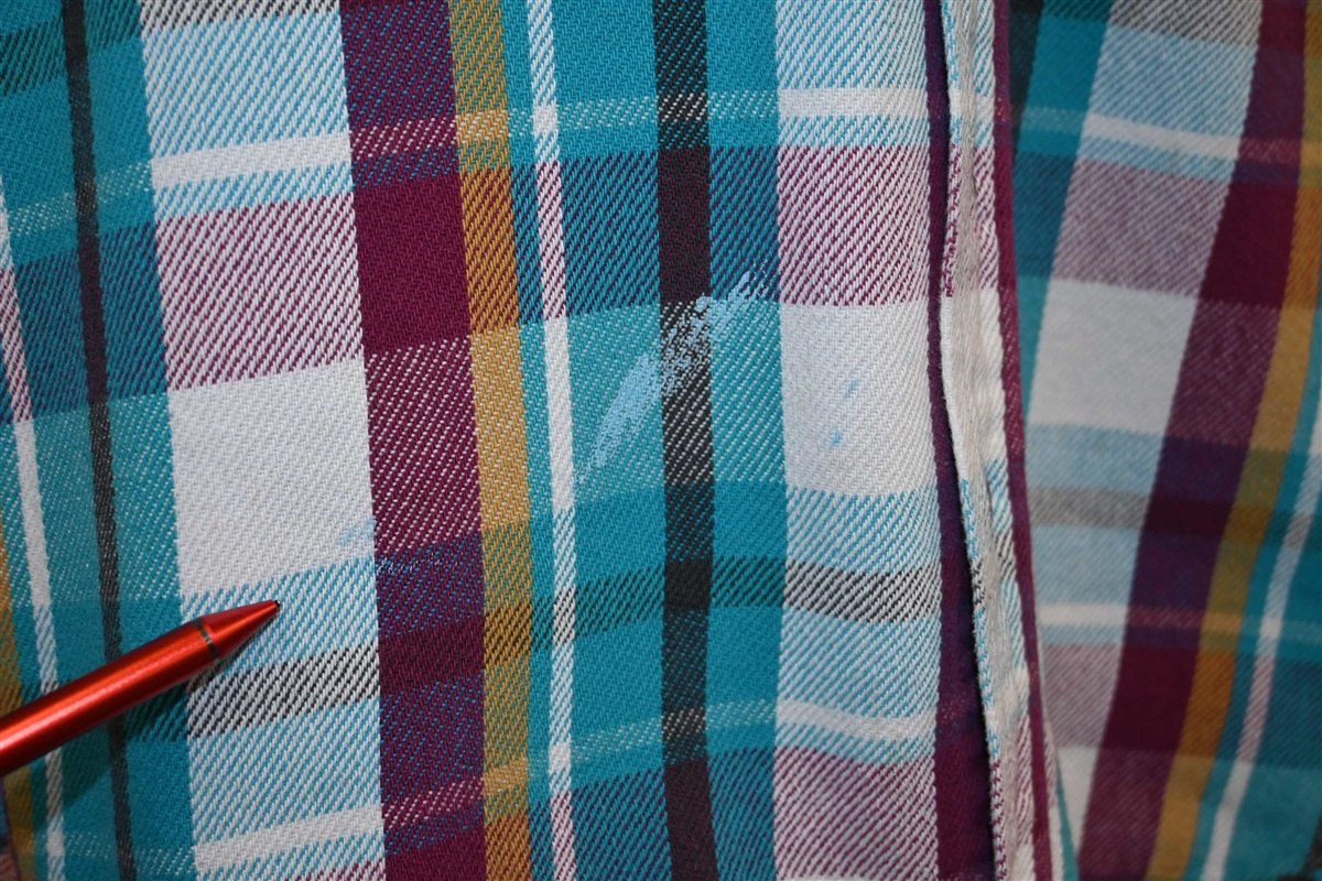 This shirt fits like a modern men's Extra Large. There are paint spots on the front, see pics