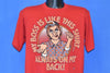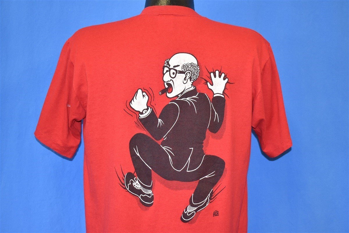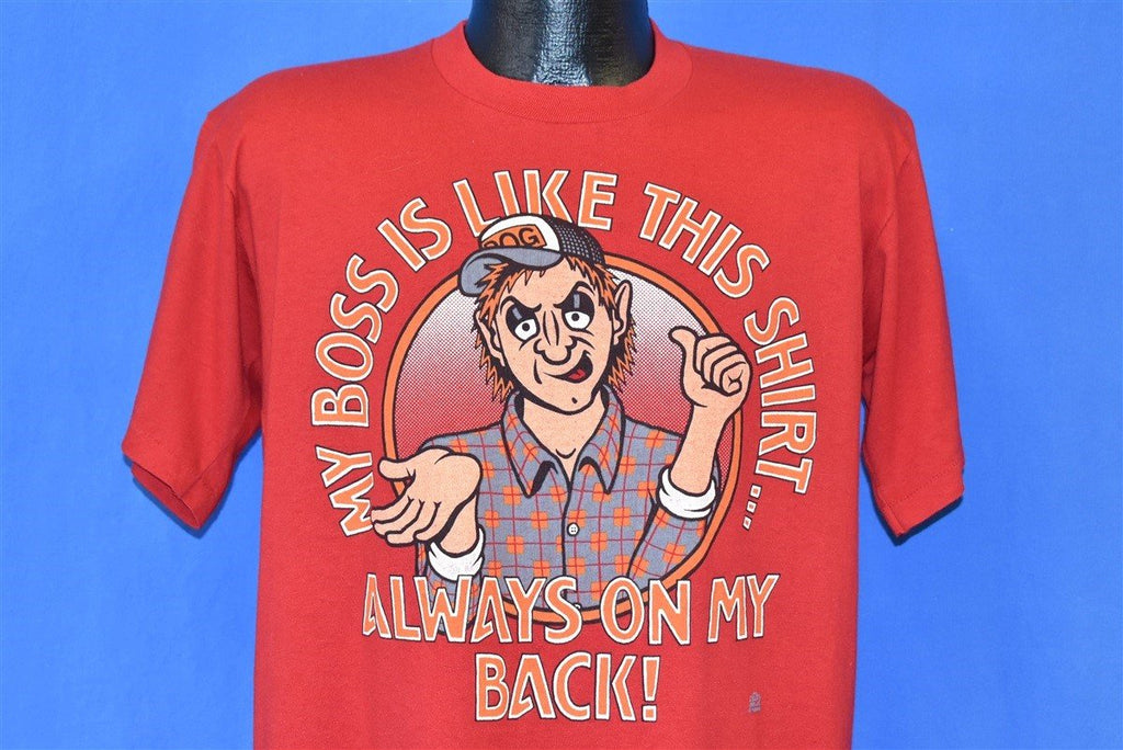 This hilarious t-shirt from the 80s features some work humor, showing a frustrated worker on the front with the text, "My boss is like this shirt... Always on my back!" On the other side of this shirt, his boss is shown literally hanging on to the back, an angry-looking older man shaking his fist and yelling with a cigar dangling from his mouth.