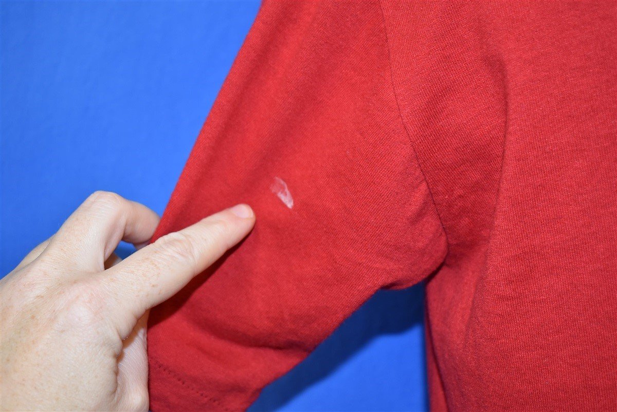 Fits like a modern unisex adult large. It has a paint spot on the back of the left sleeve, see pic.