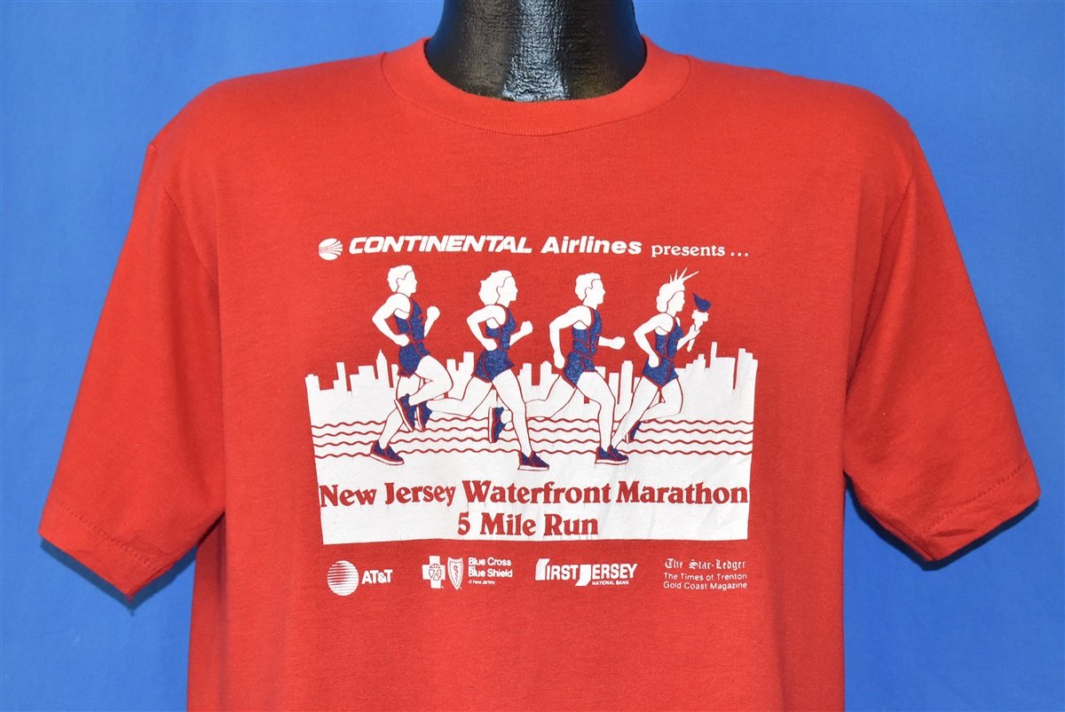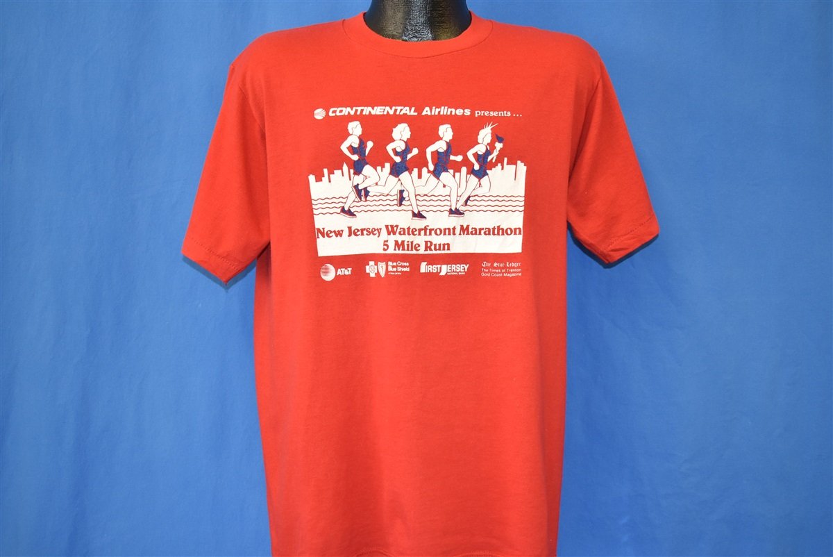 This vintage tee is for the New Jersey Waterfront Marathon, a five mile run that was organized by Continental Airlines. Event sponsors included AT&T, Blue Cross Blue Shield, First Jersey National Bank, and the Star-Ledger Magazine. The bright red tee features an image of four runners racing along the water with the city skyline in the background.