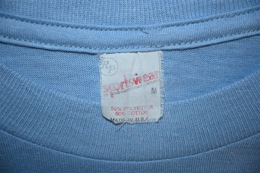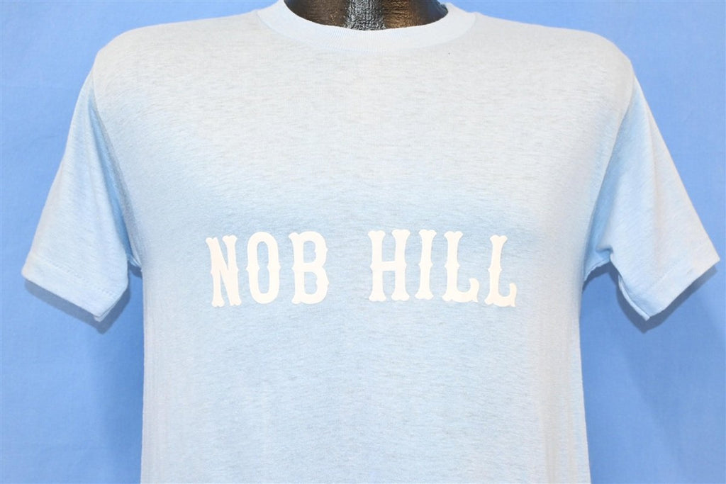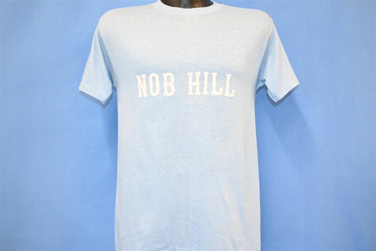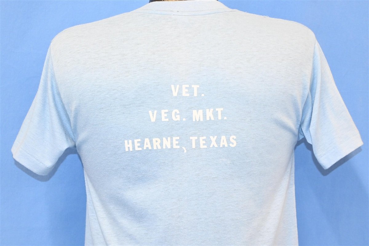 This vintage tee was made back in the 80s, and it features custom double-sided graphics that were designed using flocked iron on letters. The front reads, "Nob Hill", while the back says, "Vet. Veg. Mkt. Hearne, Texas". It's likely that the abbreviations on the back might be for local vegetable market, that was based out of the city of Hearne. Meanwhile, Nob Hill could refer to an organization or location associated with the market.