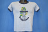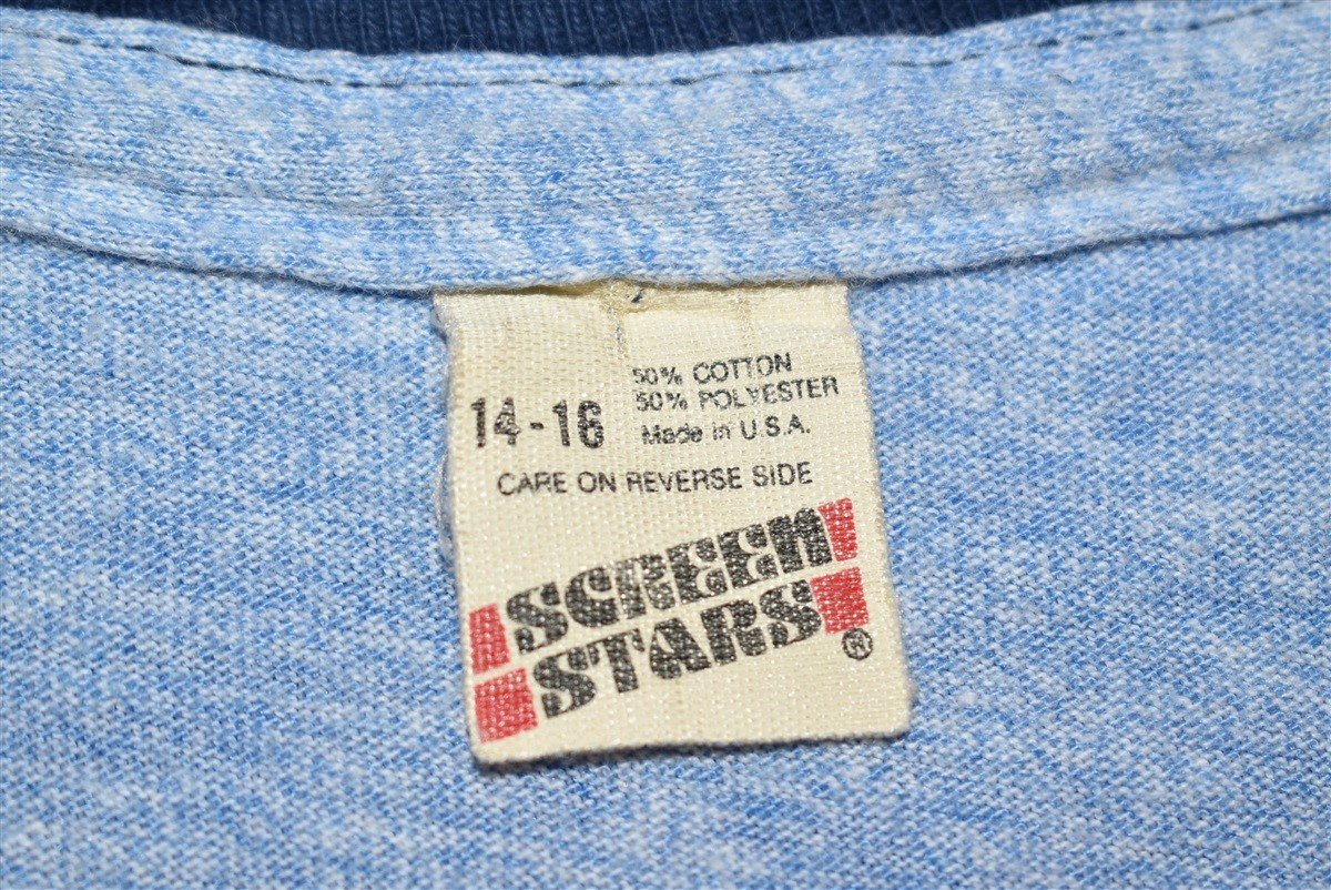 This vintage ringer has the phrase "Parkway Strings Power" written across the front, possibly from a string instrument program for aspiring musicians. The heather blue shirt also features the image of a cello along with some psychedelic graphics.
