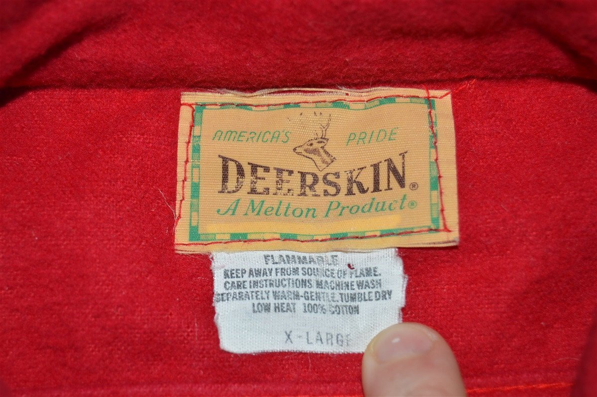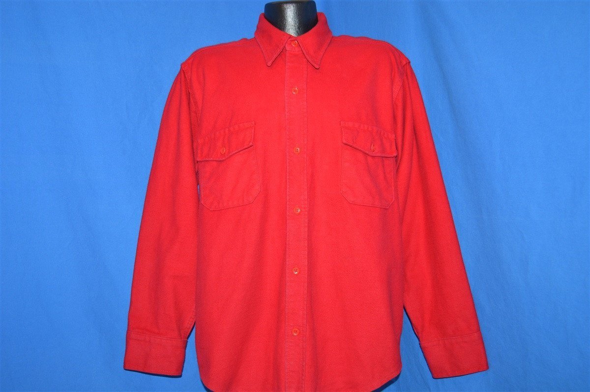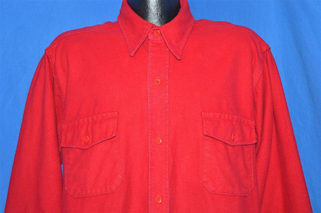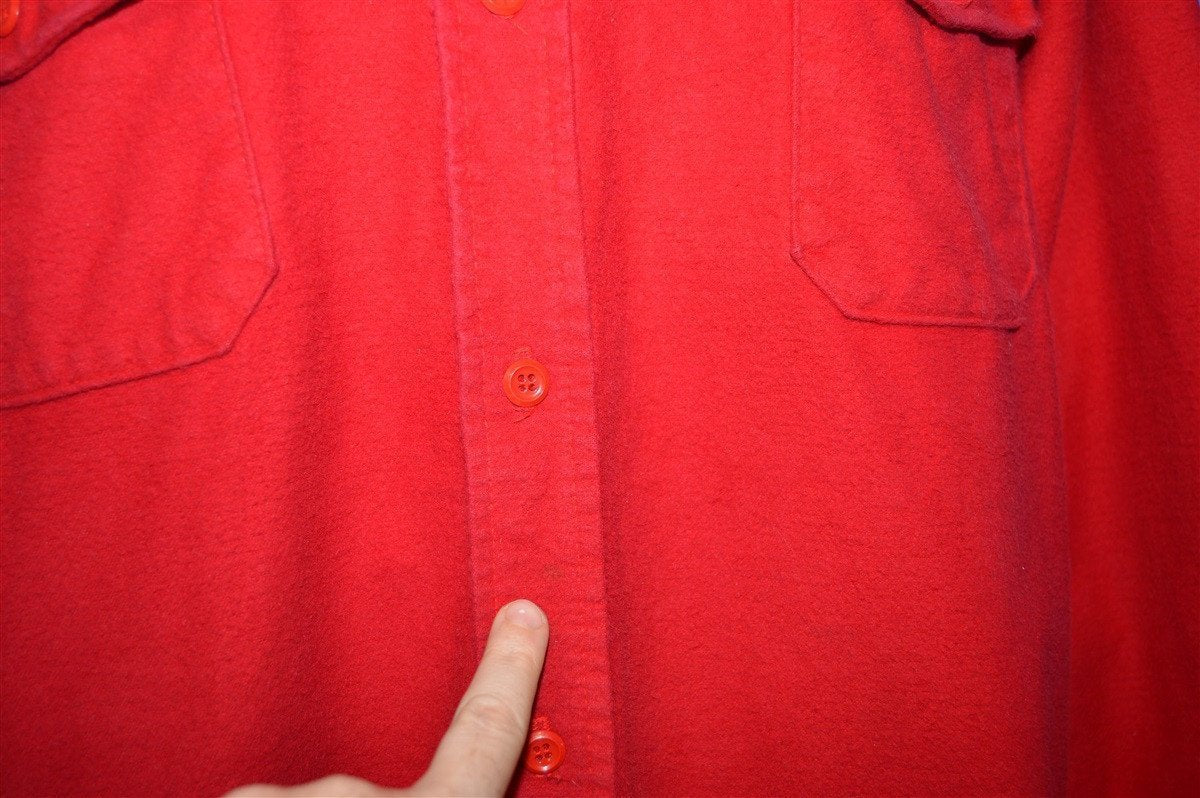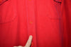 This red vintage button down shirt is made of a warm flannel material. The shirt has two chest pockets and long sleeves. The shirt is a shirt jacket style.