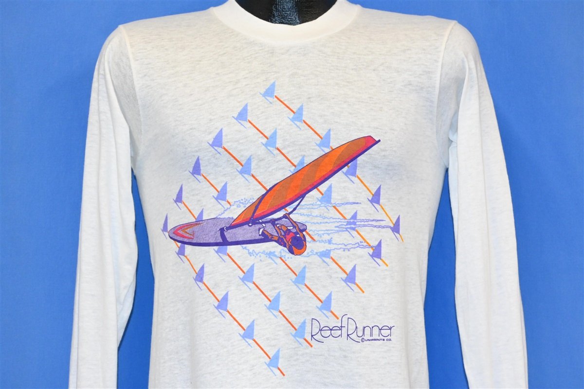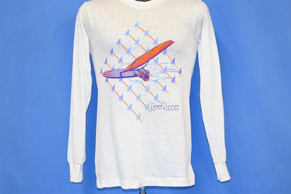 This sweet long sleeve tee is a stylish piece of surfwear from the 80s. This graphic was created by the surfwear company Reef Runner, and it showcases a windsurfer. This tee was made during the same decade that the sport really started to gain significant popularity.