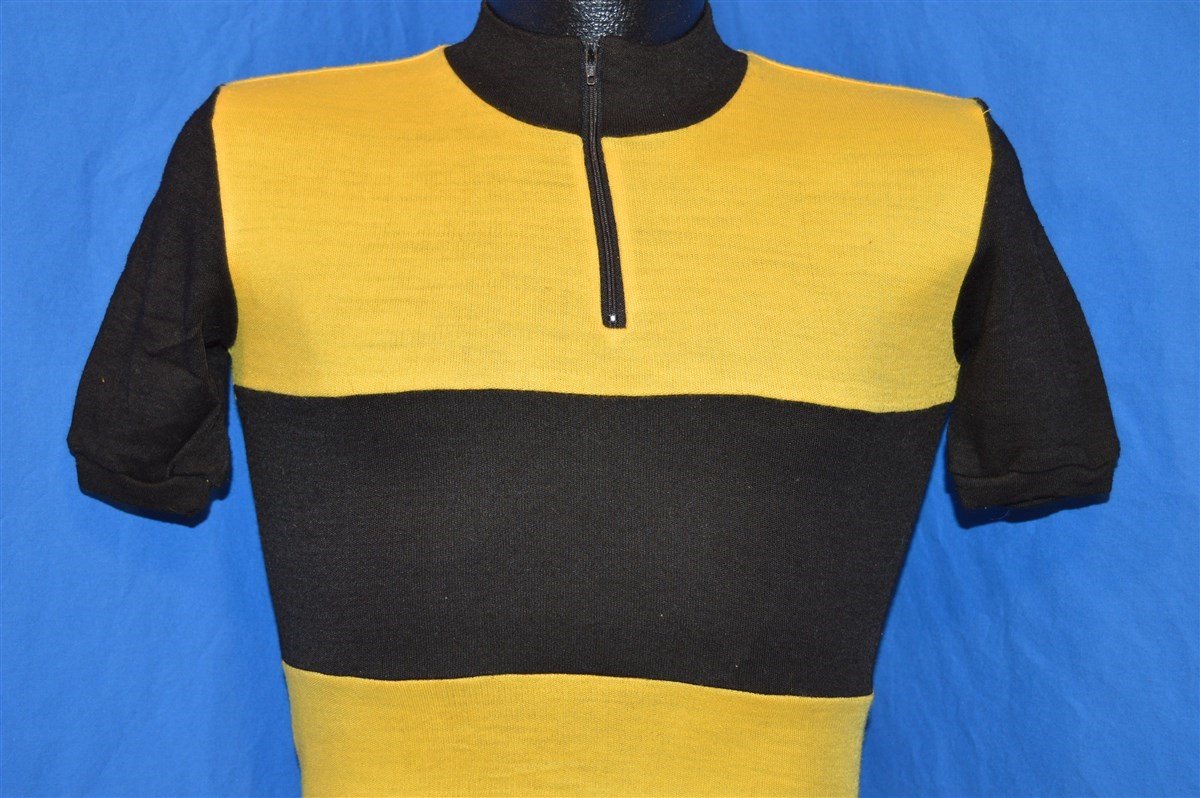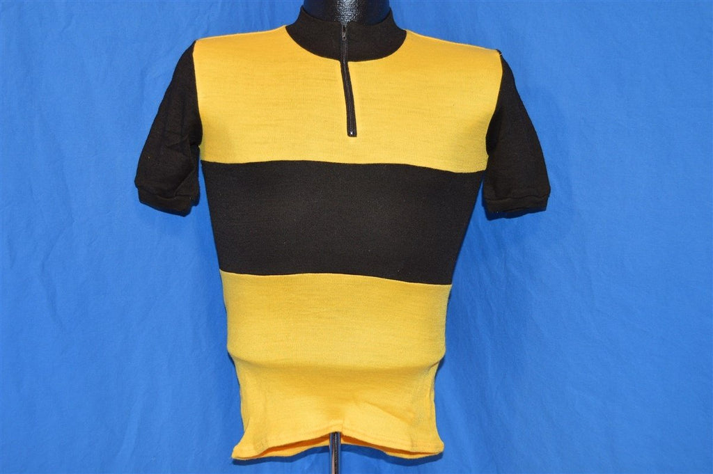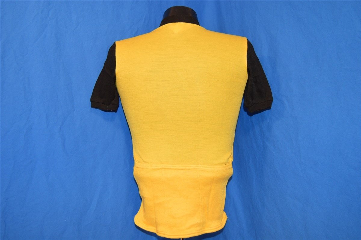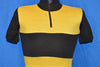 This vintage t-shirt is a yellow and black bicycle jersey. The t-shirt has a zipper at the top.