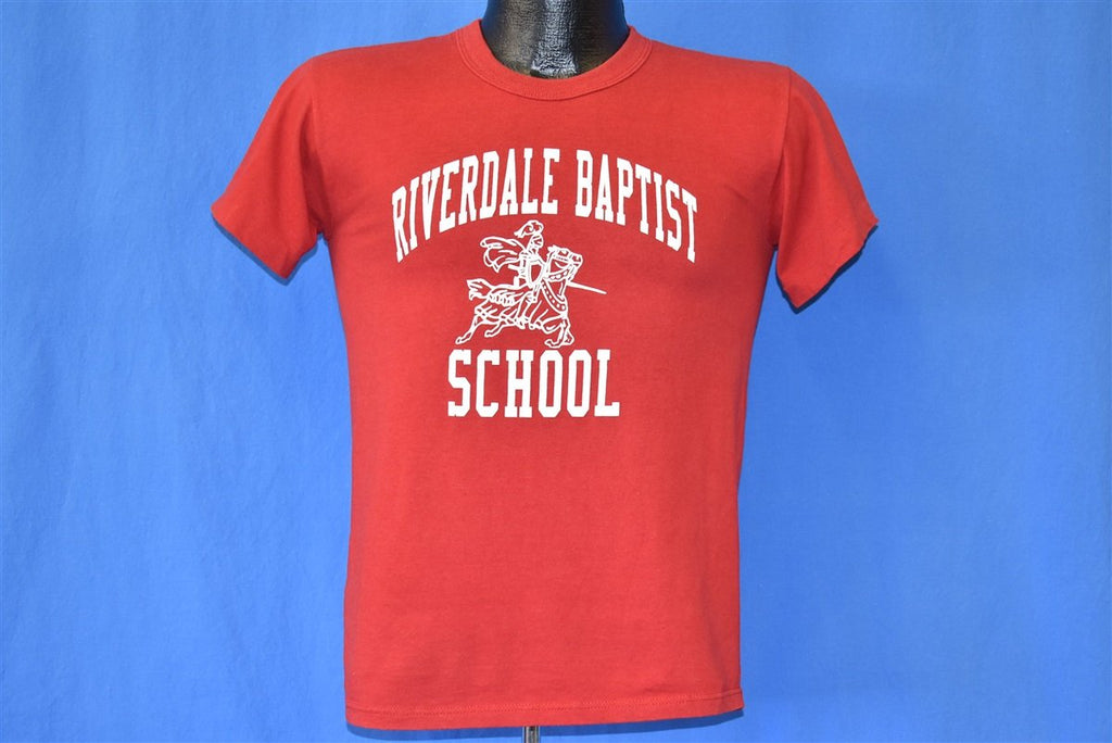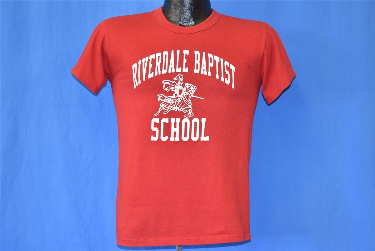 This vintage tee celebrates Riverdale Baptist School located in Marlboro, Maryland. The Riverdale Baptist School is a part of the Riverdale Ministries family. The school accommodates students from grades K3-12 and according to their mission statement the school focuses on Christ-centered education. This shirt shows off the school's mascot, a crusader.
