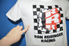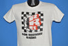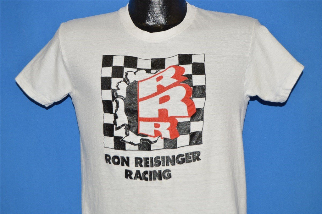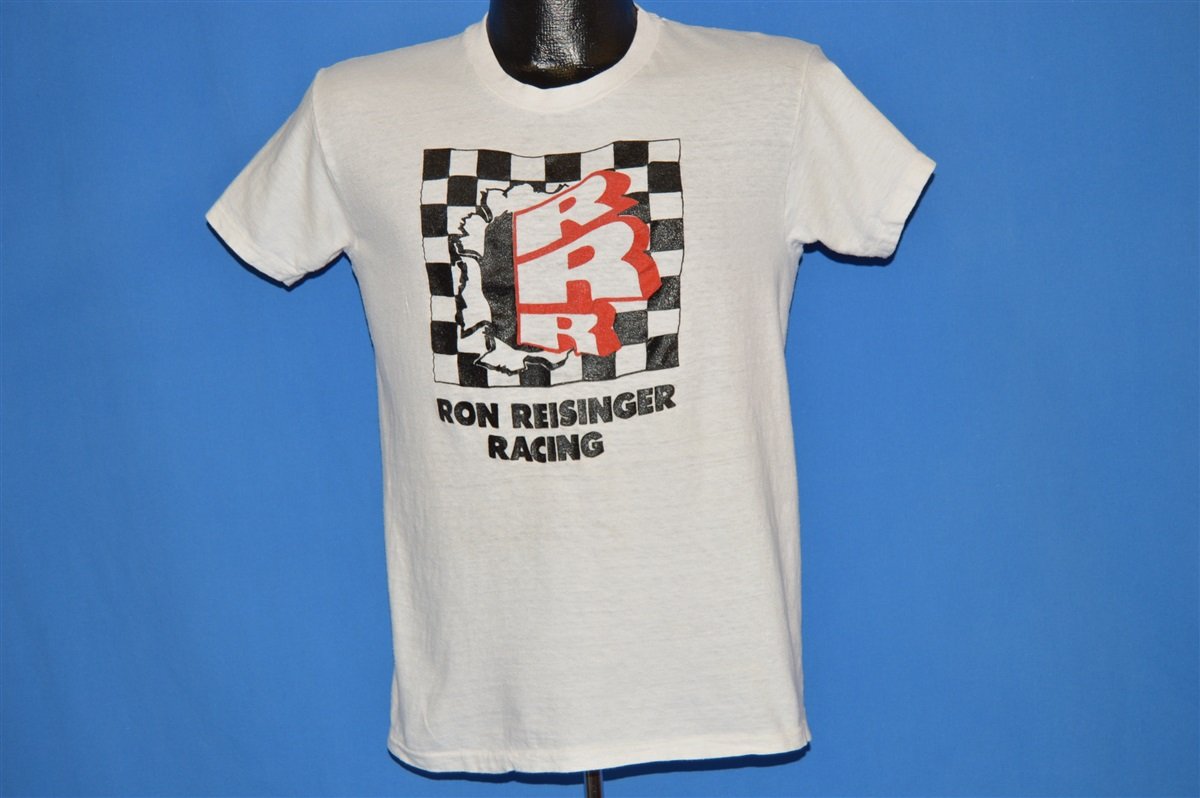 This shirt is from the 80s and features a graphic on the front of "RRR" bursting through a checkered racing flag, along with the words "Ron Reisinger Racing". This shirt is in excellent used condition.