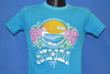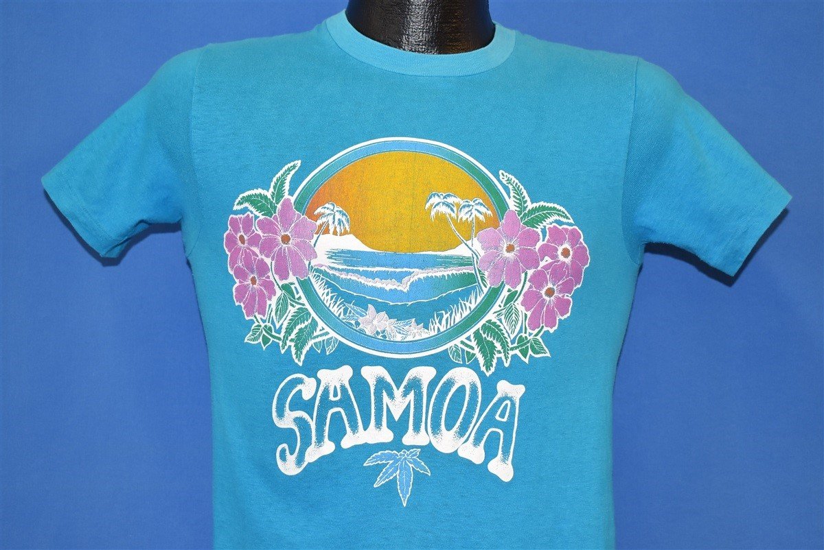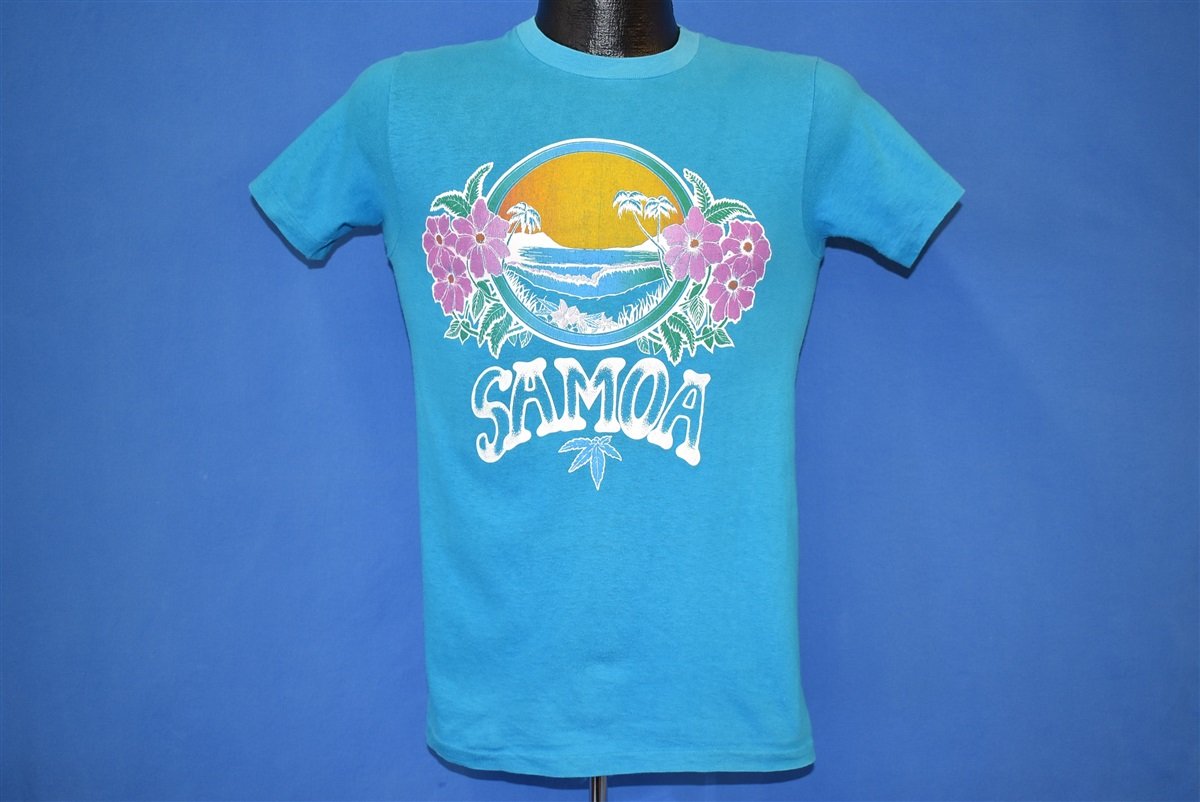 This blue tourist shirt has a graphic on the front of flowers framing a view of the ocean at sunset. It says "Samoa" underneath. Samoa is a country consisting of two main islands, Savai'i and Upolu, and four smaller islands.
