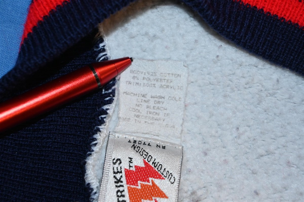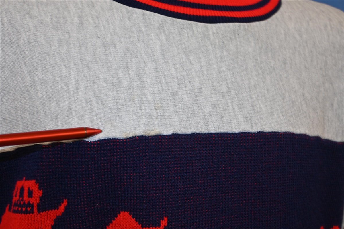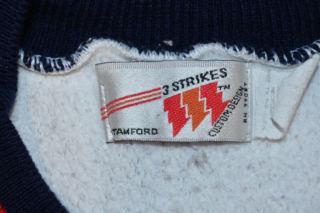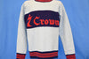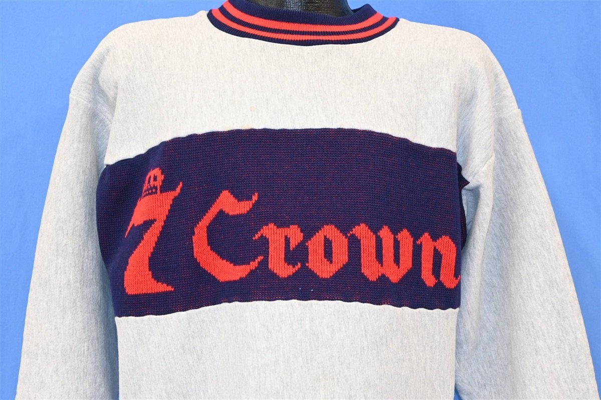 This awesome crewneck was made to promote Seagram's Seven Crown whiskey. Seagram's was a Canadian beverage company famous for both distilled and non-alcoholic drinks, like ginger ale, tonic water and club soda. Seven Crown used to be one of the company's most popular distilled drinks, alongside VO and Crown Royal. The whiskey was also one half of the popular cocktail, the "Seven and Seven". This crew neck is a reverse weave, which means the weave goes vertical instead of the traditional horizontal.