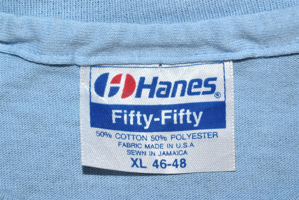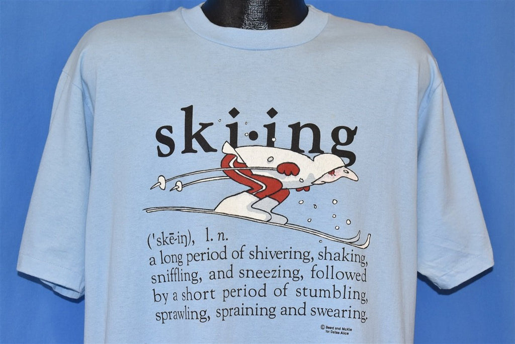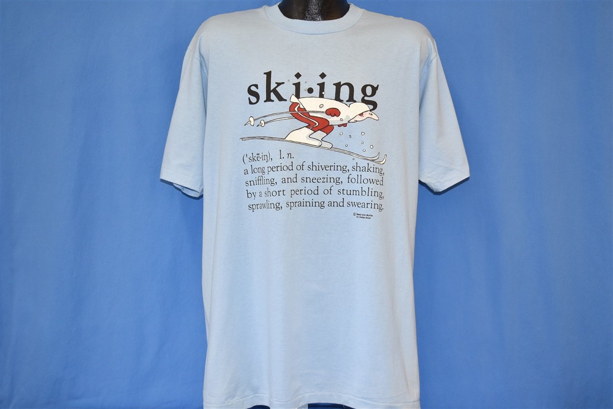 This awesome tee is the perfect getup for skiiers and snow sport athletes. It's vintage from the 1980s, featuring cartoon graphics, soft poly cotton, and an some good old fashioned humor. The dictionary definition for skiing, as defined here is "A long period of shivering, shaking, sniffling, and sneezing, followed by a short period of stumbling, sprawling, spraining, and swearing."