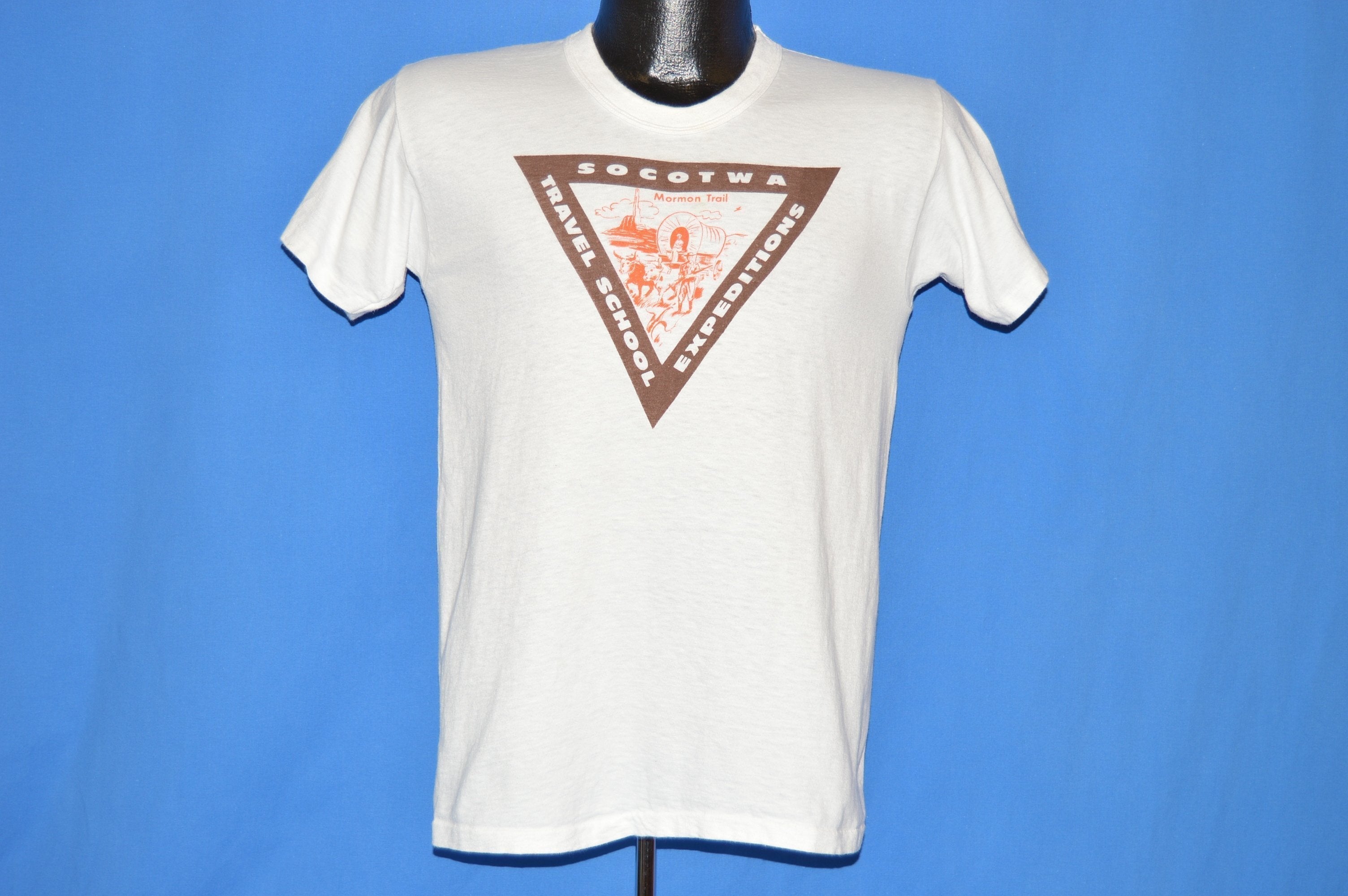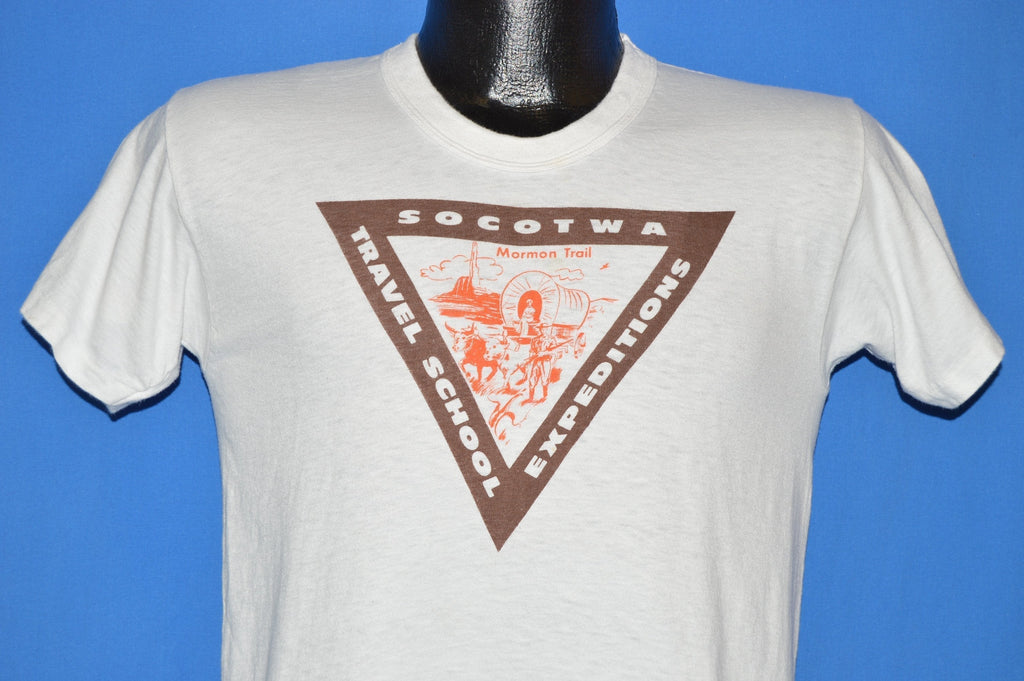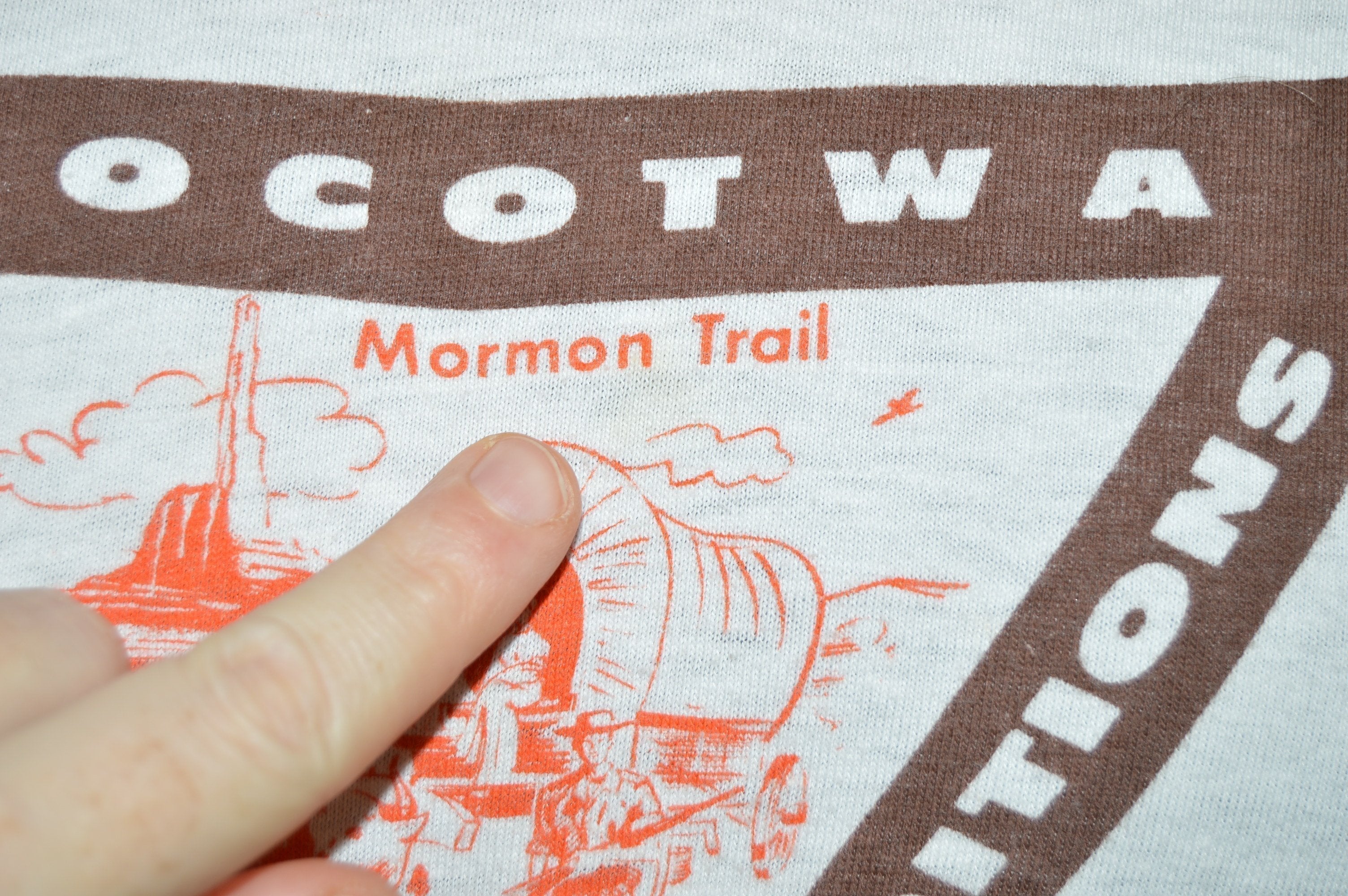 This vintage tee has a long history dating back to the 1950s. It's held up incredibly well over the years and has plenty of life left in it. The graphic commemorates an expedition along the Mormon Trail led by SOCOTWA (South Cottonwood Ward) Travel School, a nonprofit organization which originated with the Eagles Club of the South Cottonwood Ward in Salt Lake City, Utah in 1948. These scout trips became super popular and SOCOTWA expanded into a corporation by 1953.