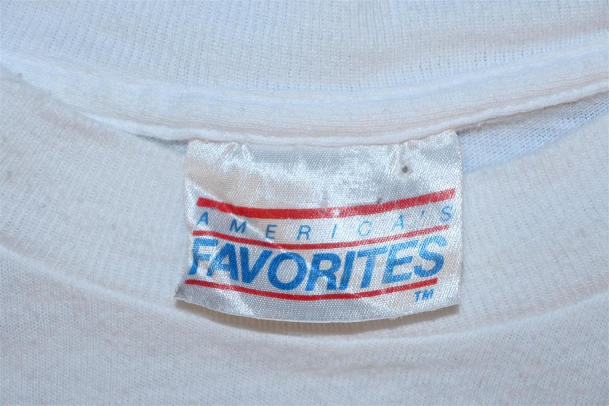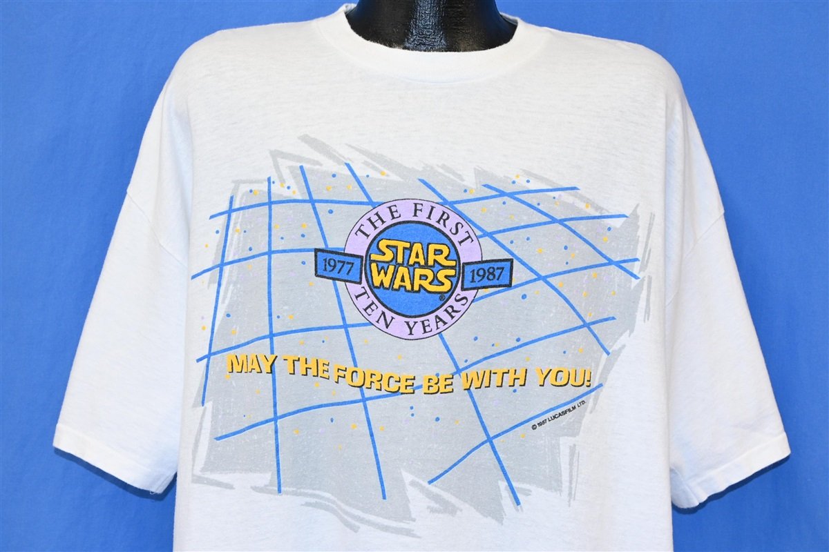 This awesome vintage Star Wars t-shirt is from the year 1987, exactly ten years after the premiere of the first film in this beloved science fiction franchise. This shirt features a colorful celebratory graphic commemorating the ten year anniversary of Star Wars and it includes iconic quote "May the force be with you!"