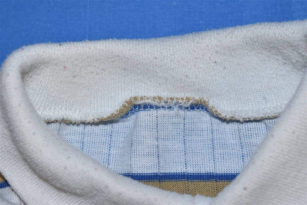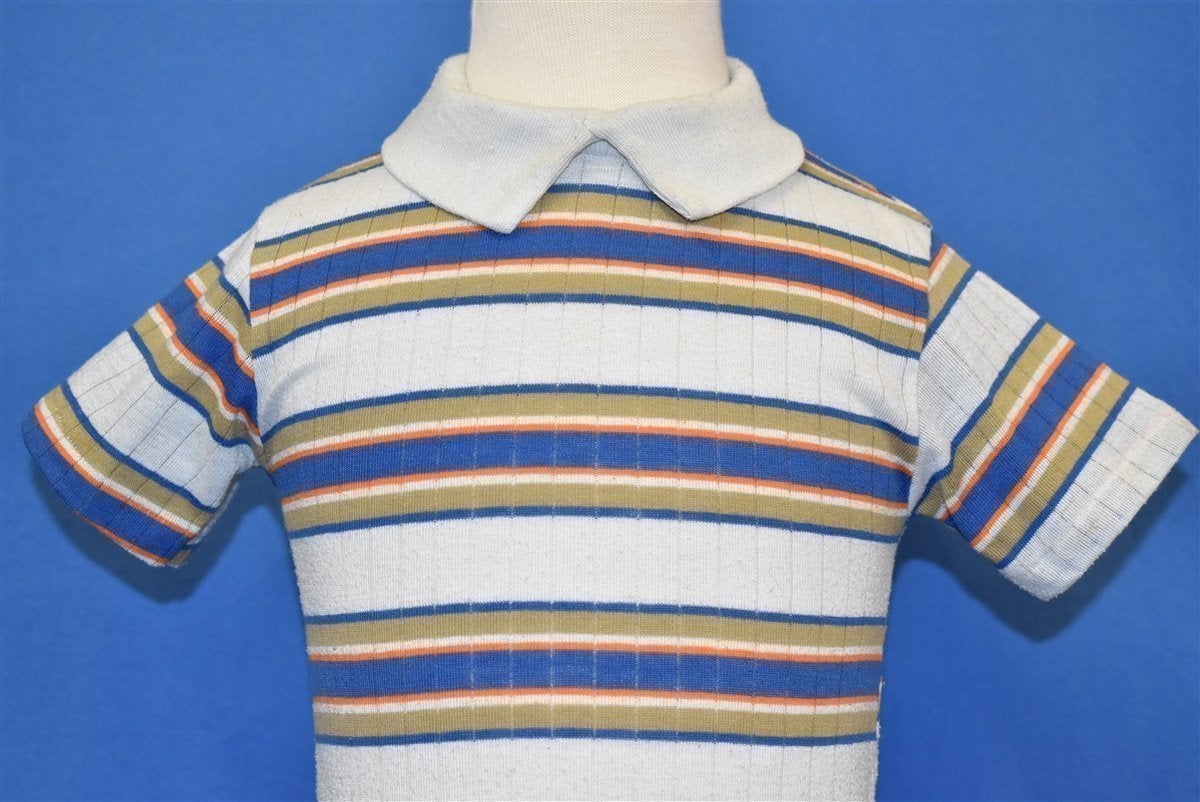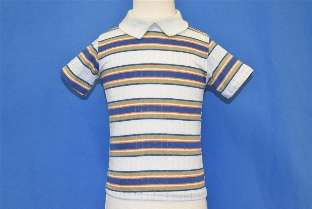 This vintage kid's shirt was made back in the 80s. The off white shirt has a polo style collar and is decorated with brown and blue stripes running horizontally across the front and back.
