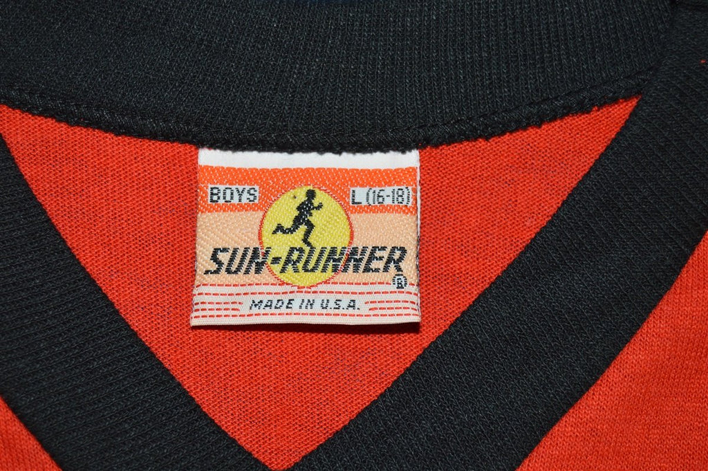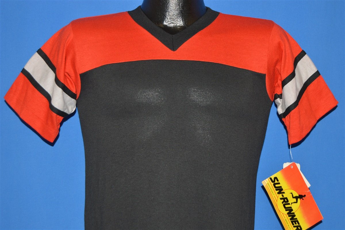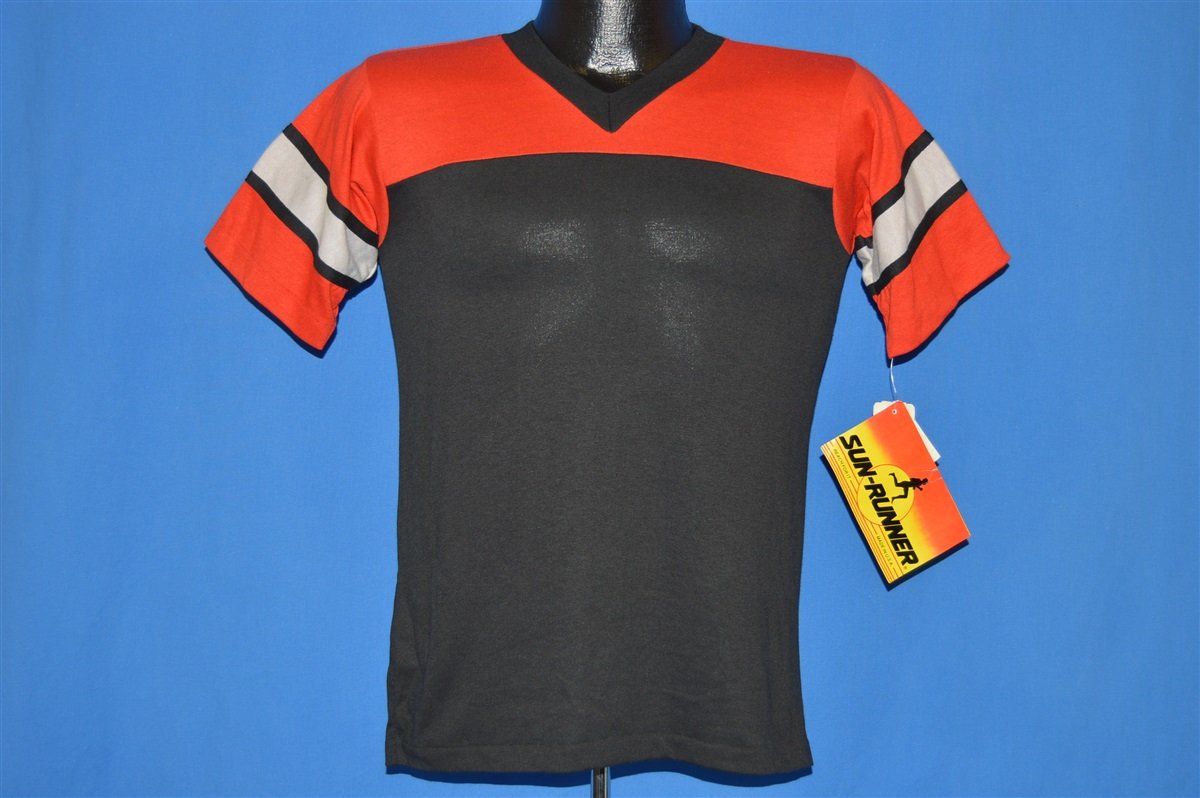 This vintage tee is a 1980s original and completely new with tags. It perfectly captures that 80s vibe with a sporty jersey style, a v-neck collar, and soft cotton blend. Great for wearing as is or adding custom print.
