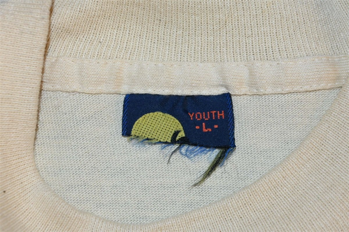 Fits like a modern unisex youth large. This shirt is deadstock, unworn. There is some light discoloration and a flaw in the graphic, see pics.