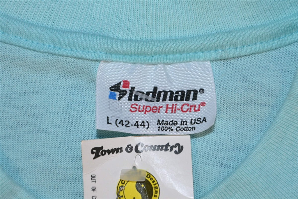Fits like a modern unisex adult large. This shirt is deadstock, unworn and new with tags. There are some spots, see pics.