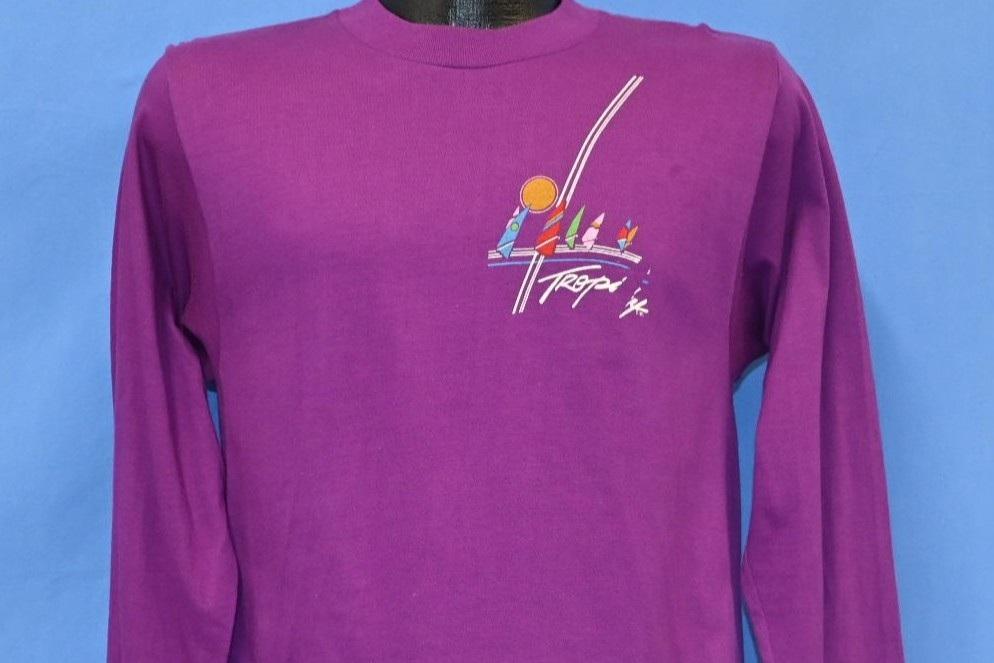 This sweet vintage surf tee was made by the apparel brand Tropix, and it features a simple yet colorful graphic that celebrates the sport of windsurfing. This shirt has long sleeves, making it perfect for a breezy day at the beach or a cool summer evening.