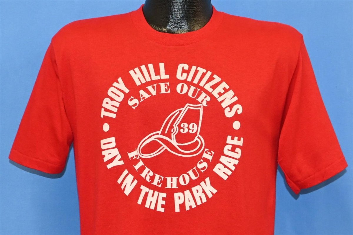 This cool tee was made for the non-profit community development organization known as Troy Hill Citizens. This group was founded in the early 70s to benefit the residents of the Troy Hill neighborhood in Pittsburgh, Pennsylvania, and this shirt commemorates a fund raising event to help preserve the local Fire Station #39. While the firehouse was recognized in 2001 by the Pittsburgh History & Landmarks Foundation, locals have spent decades fighting to protect the building's historical significance. This shirt advertises a race that was held in Troy Hill Citizens Park, called the Day in the Park Race.