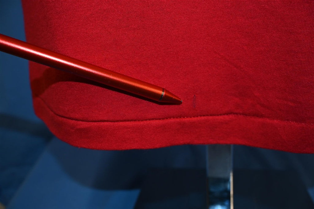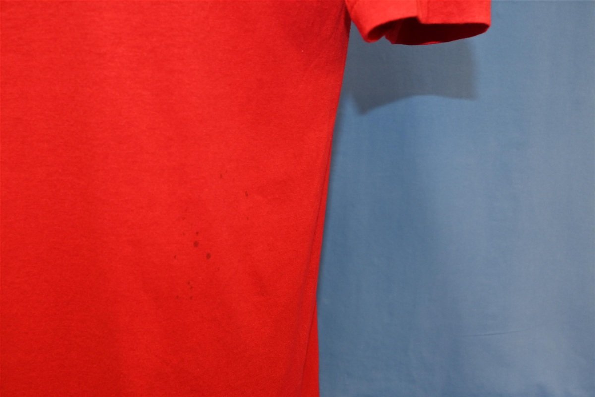 The tag says large but this shirt fits like a modern unisex adult medium. There are some spots on the back and a small run, see pics.