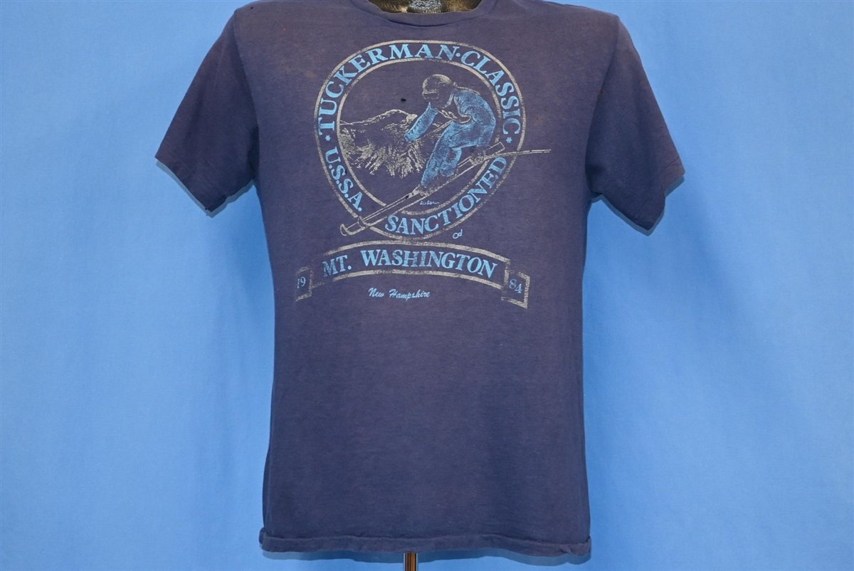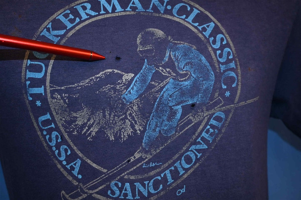 This sweet tee is from an 80s ski competition called the Tuckerman Classic. This 1984 race was sanctioned by the US Ski & Snowboard Association or USSA, and held at Tuckerman Ravine on Mount Washington in New Hampshire. The Tuckerman Ravine is well known by "spring skiers", because of its higher temperatures and lower risk of avalanches.
