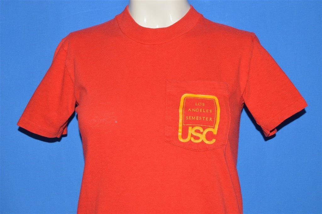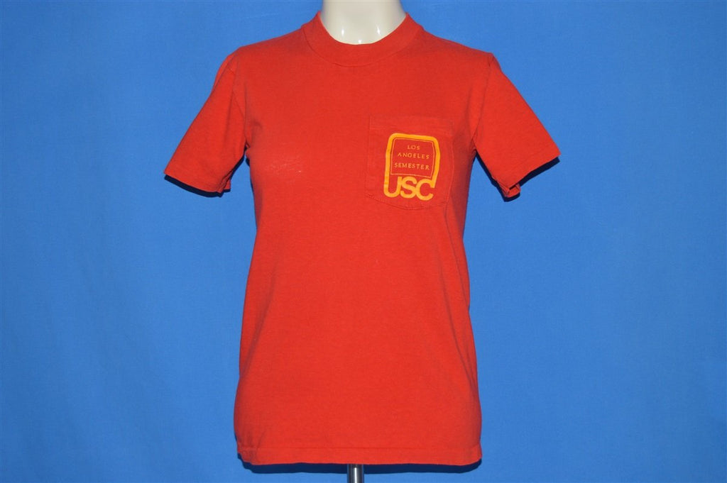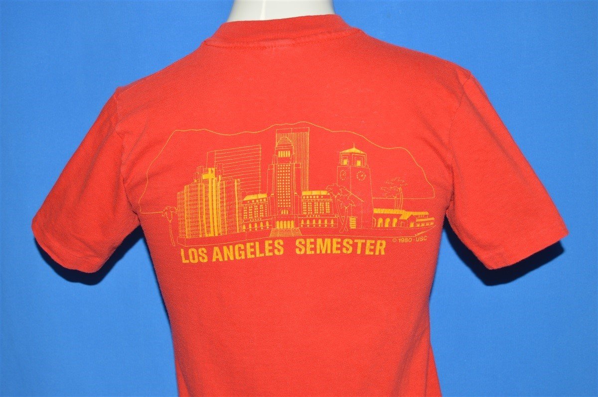 This shirt has a graphic on the back of Los Angeles, and the words "Los Angeles Semester". On the front upper left, there is a pocket with the letters "USC". USC stands for University of Southern California, which is located in Los Angeles.
