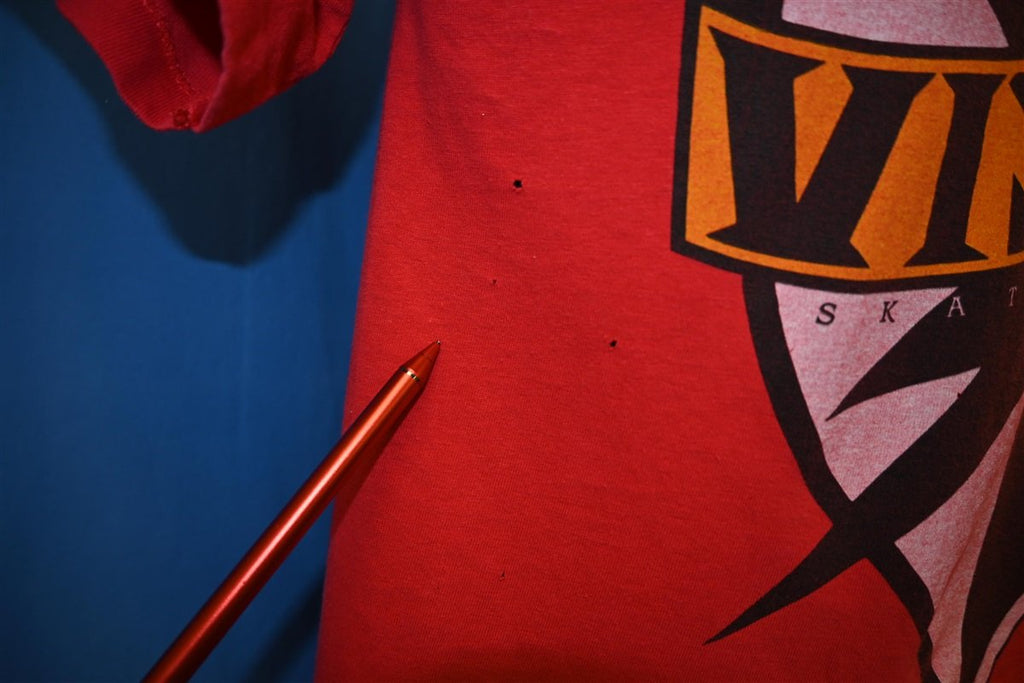 Fits like a modern unisex adult oversized small. This shirt is distressed with several small holes throughout, see pics.