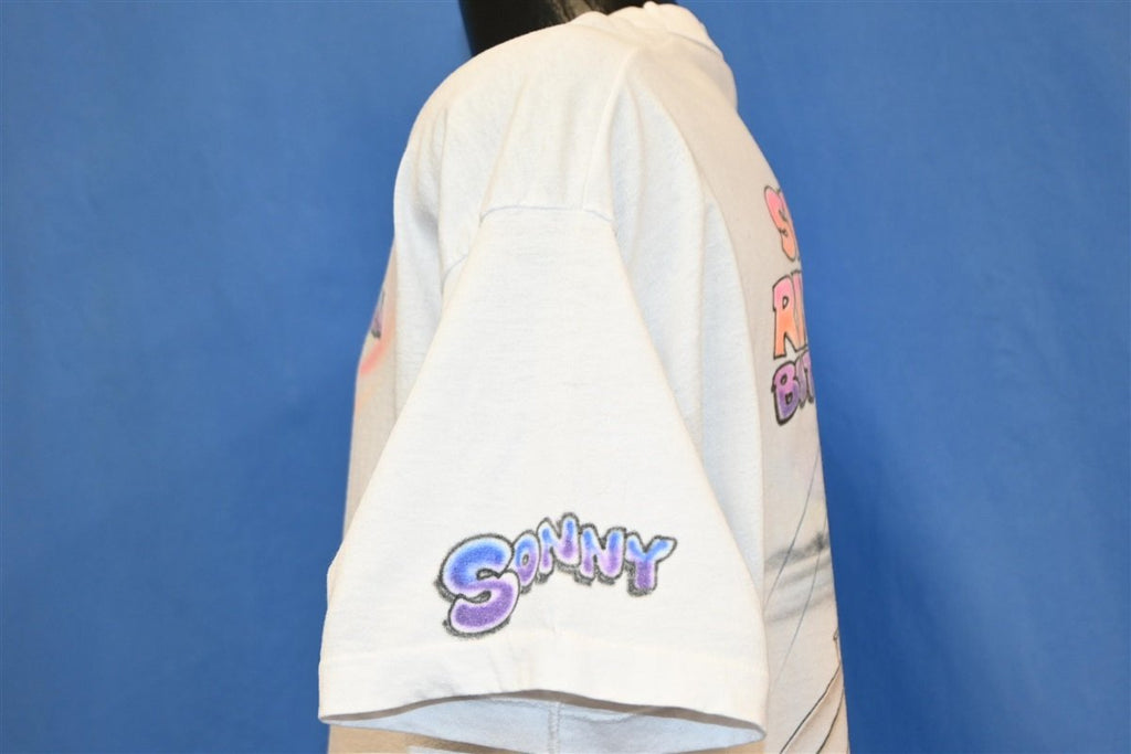 Fits like a modern unisex adult extra large, Sonny on the right sleeve while wearing, larger graphic is on the back