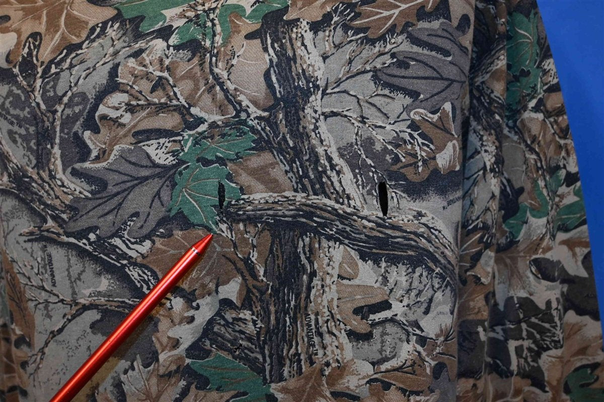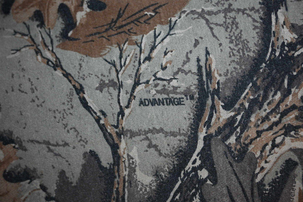 This sweet camouflage tee has long sleeves, and comes decked out in an advantage style camo. This style of camouflage was introduced during the early 90s, as a more detailed and effective version of the classic Realtree camo pattern. Realtree camo set itself apart in the 80s, with its more realistic renderings of tree bark and foliage. These patterns were favored by hunters, who felt that these less abstract camo designs were ideal for lessoning visibility.