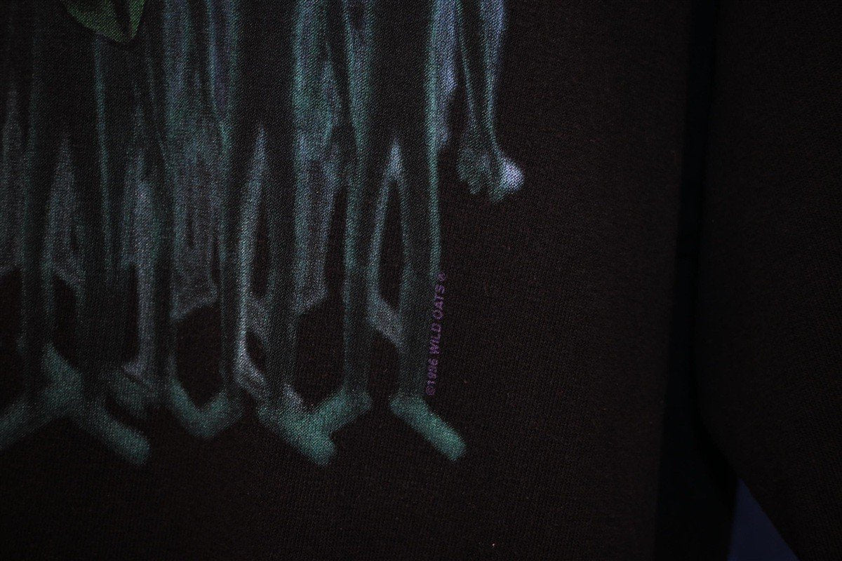 This tee is made by Wild Oats, Ocean Atlantic Textile Screen-Printing Inc., which was founded by Jerry Klause in 1981 located in Ocean City, New Jersey. The brand closed down in 1999 making it a wonderful find to see a Wild Oats tee today.