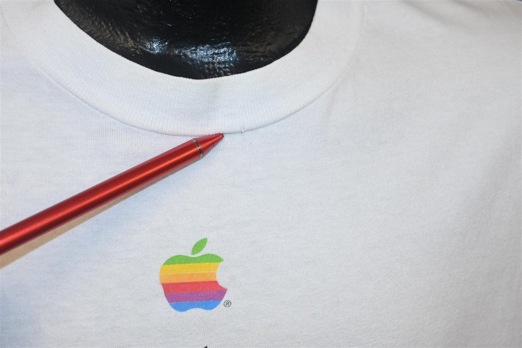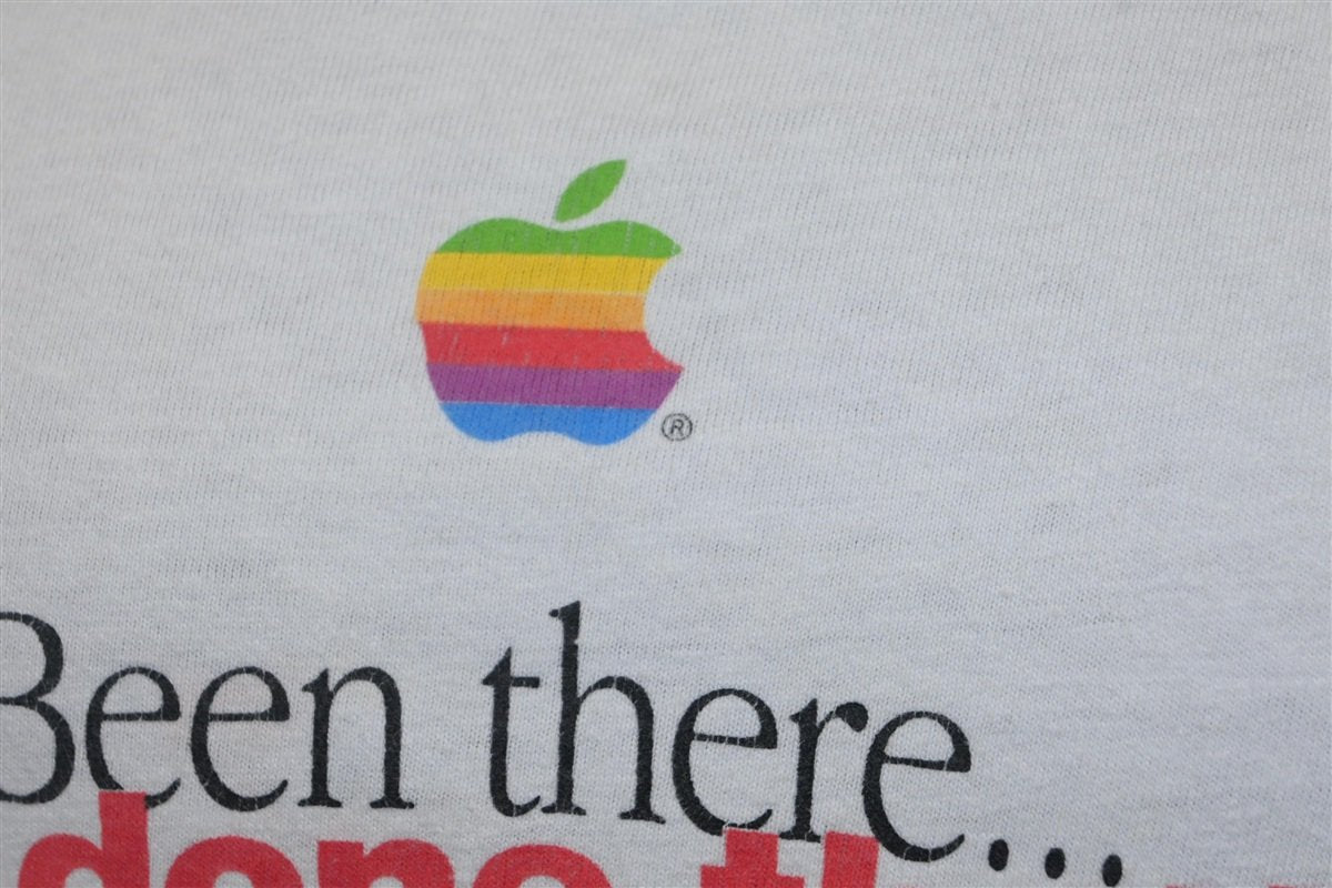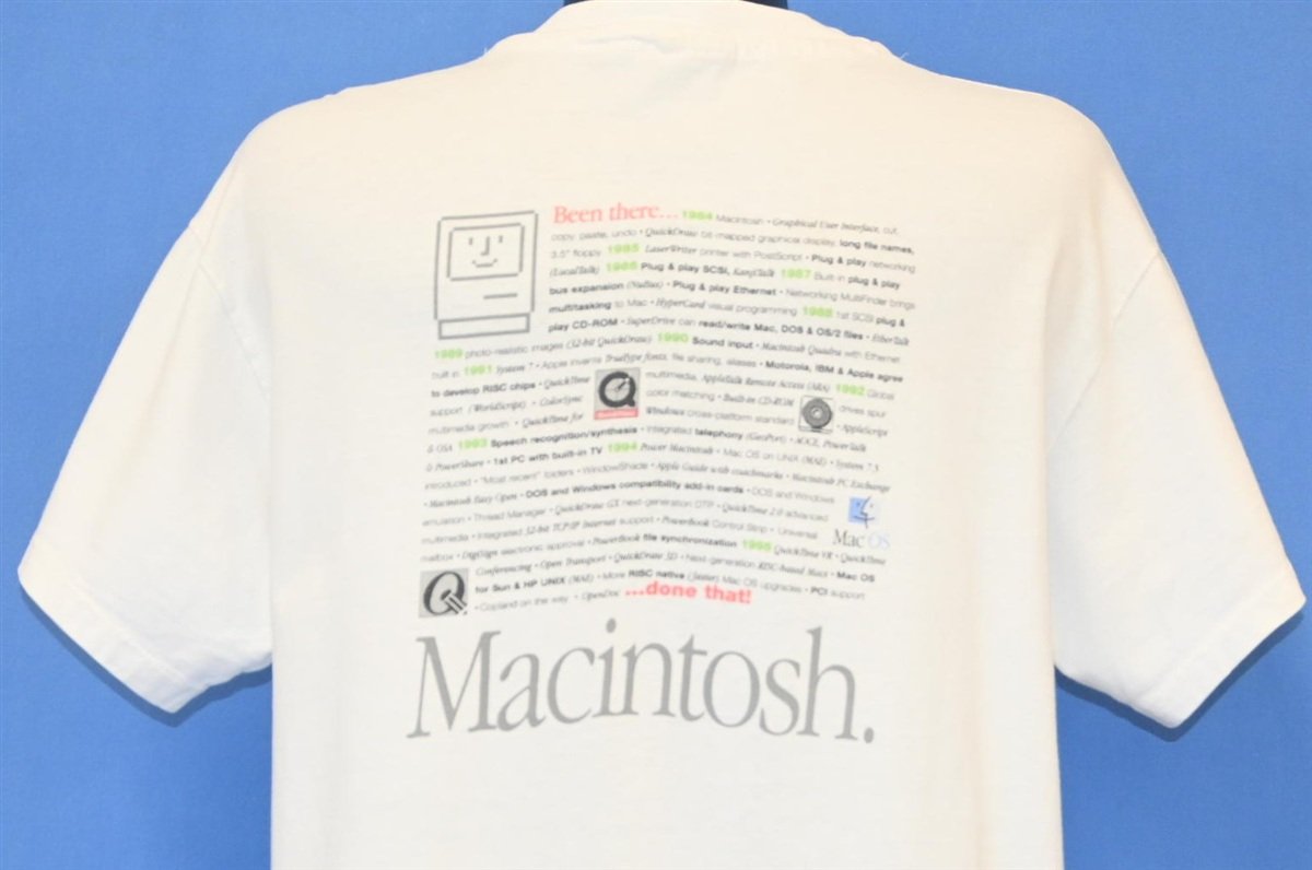 This cool double-sided tee promotes the Apple company and their popular brand of personal computers, the Apple Macintosh. The shirt includes the phrase "been there... ...done that!" and the back details the history of Mac computers spanning from their debut in 1984 to when this shirt was made in 1995. The Mac originally began development in the 70s under the supervision of Jef Raskin, but the project was later taken over by company co-founder, Steve Jobs in 1981. Jobs later left Apple for NeXT after he was forced out by CEO John Sculley, but he returned after Apple acquired NeXT in 1997. This ultimately saved the company, and the following year a new and highly successful computer reminiscent of the original Macintosh was released, the iMac.