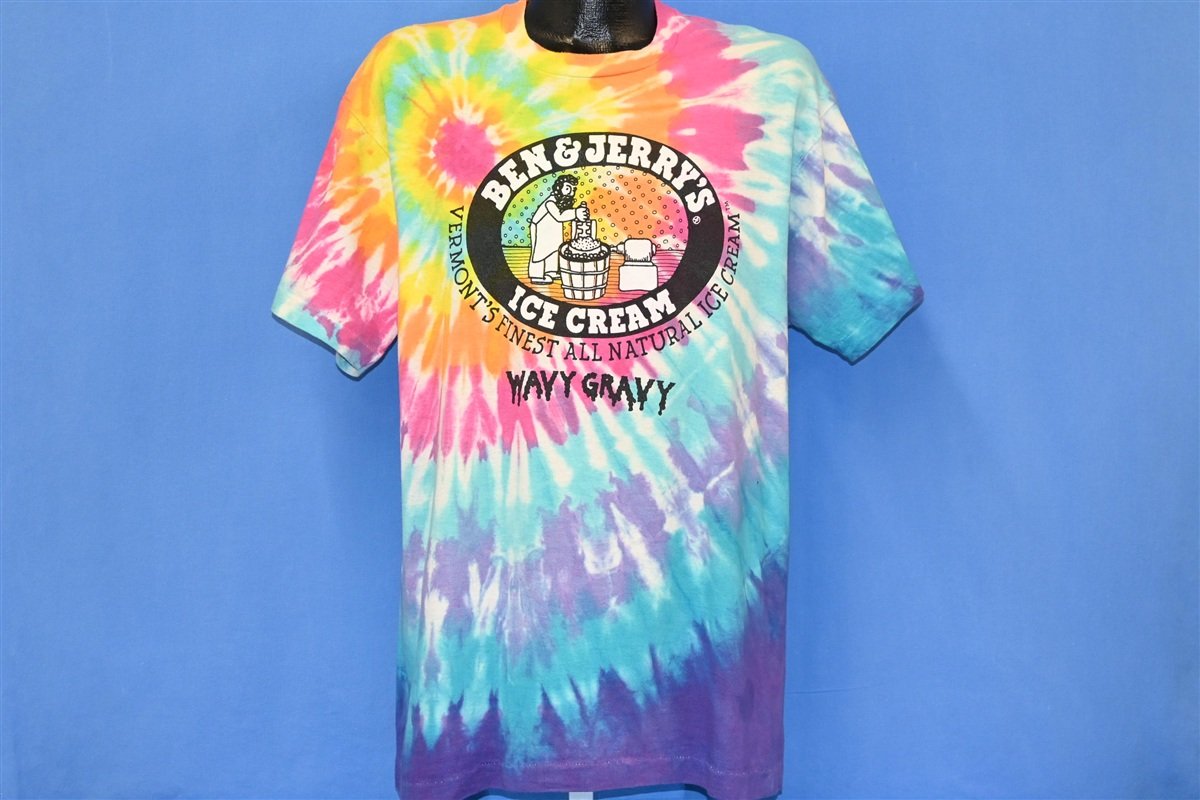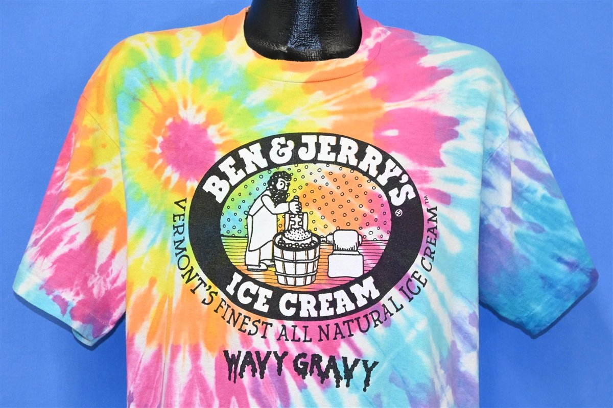 This excellent tie dye tee celebrates a beloved cult classic flavor from Ben & Jerry's, called Wavy Gravy. The Vermont-based ice cream company first introduced the flavor in the early 90s, and it was inspired by 60s counter cultural icon and entertainer, Wavy Gravy. A vocal peace activist, he was also known for being the master of ceremonies at Woodstock 1969, and serving as the official clown of the celebrated jam band, the Grateful Dead.