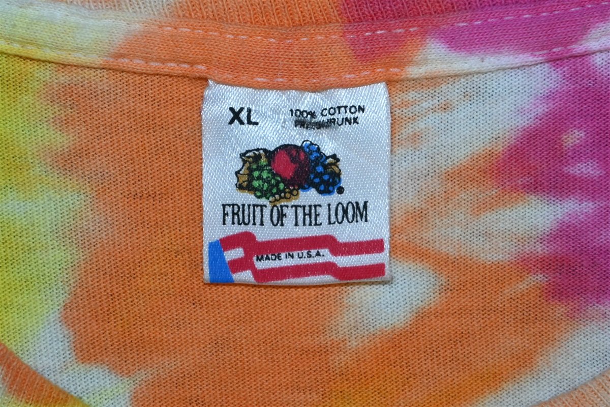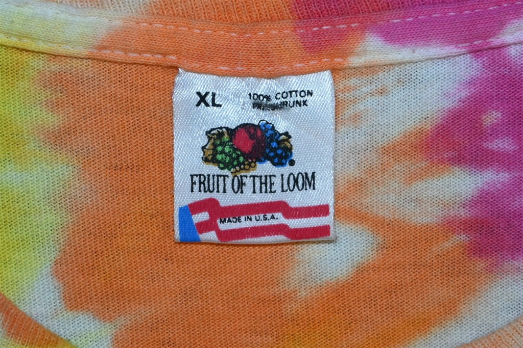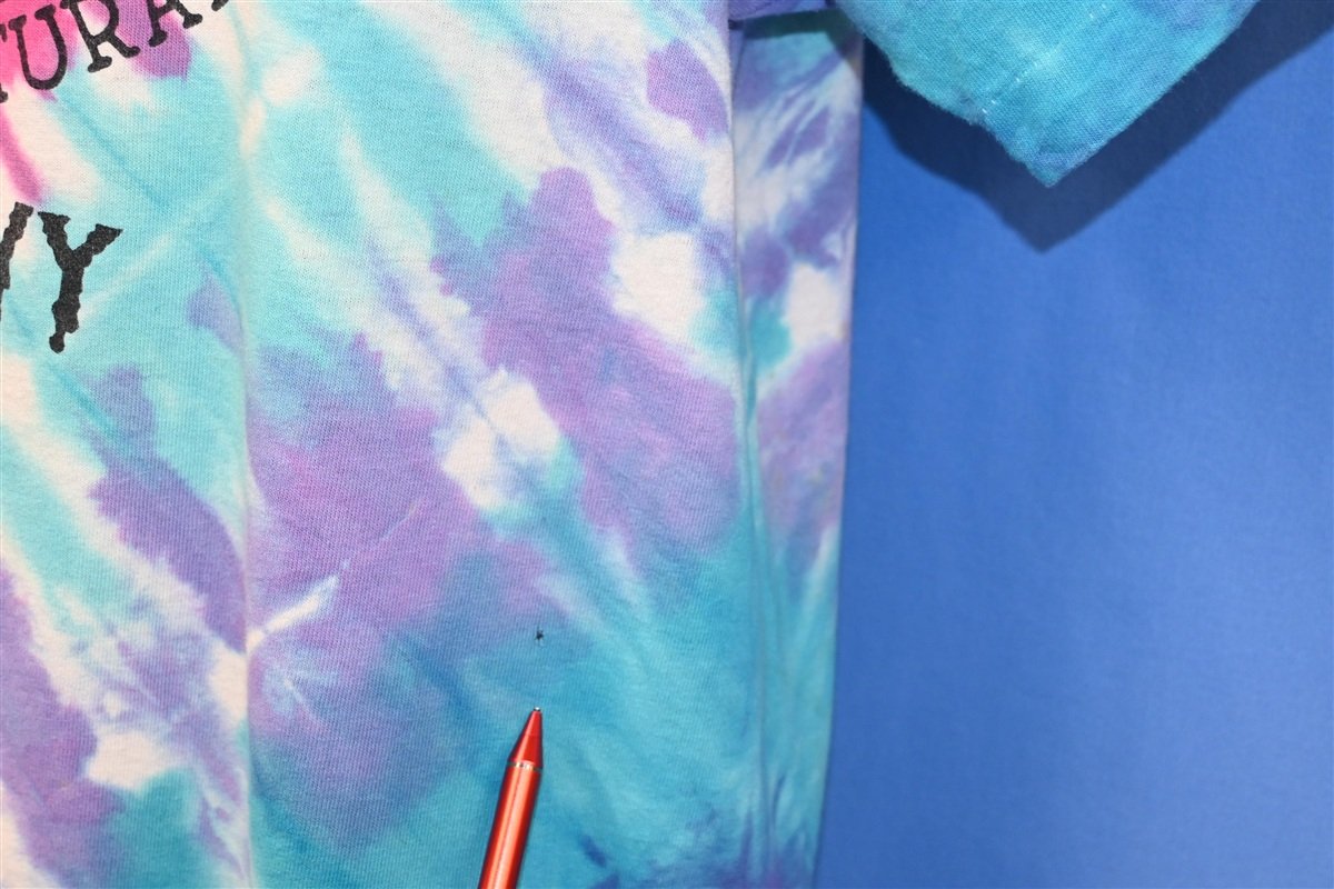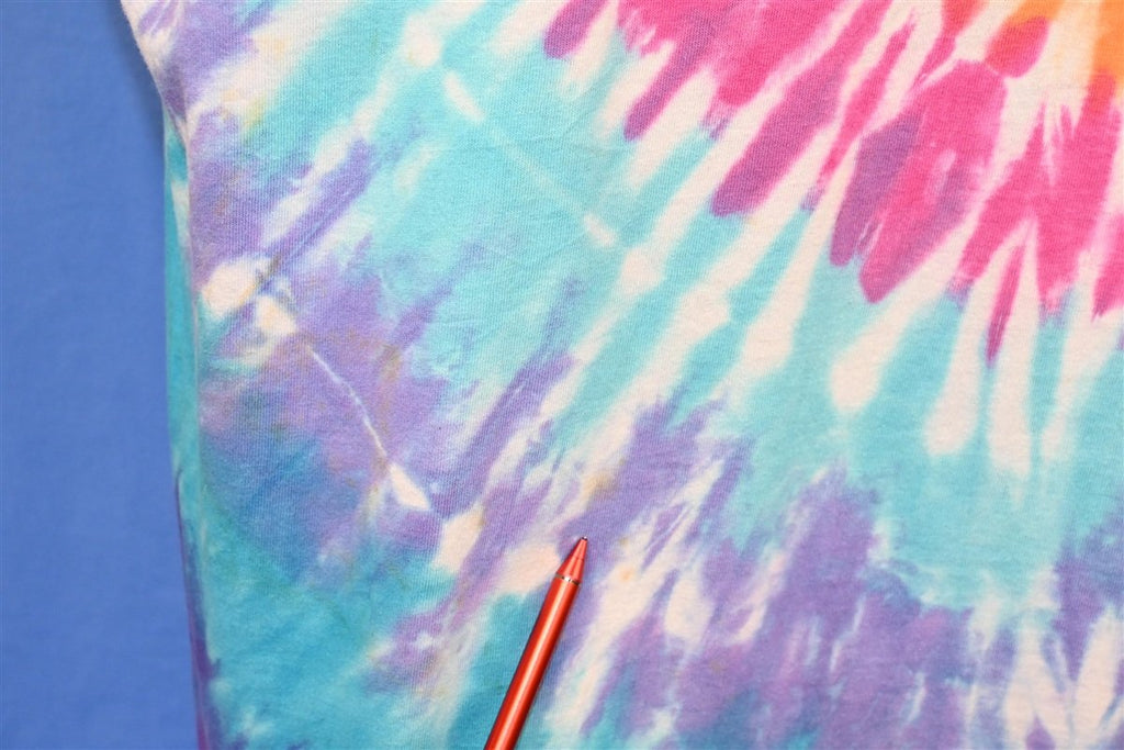 Fits like a modern unisex adult Extra Large. There's a small hole on the front and some minor discoloration that blends into the tie dye, see pics.