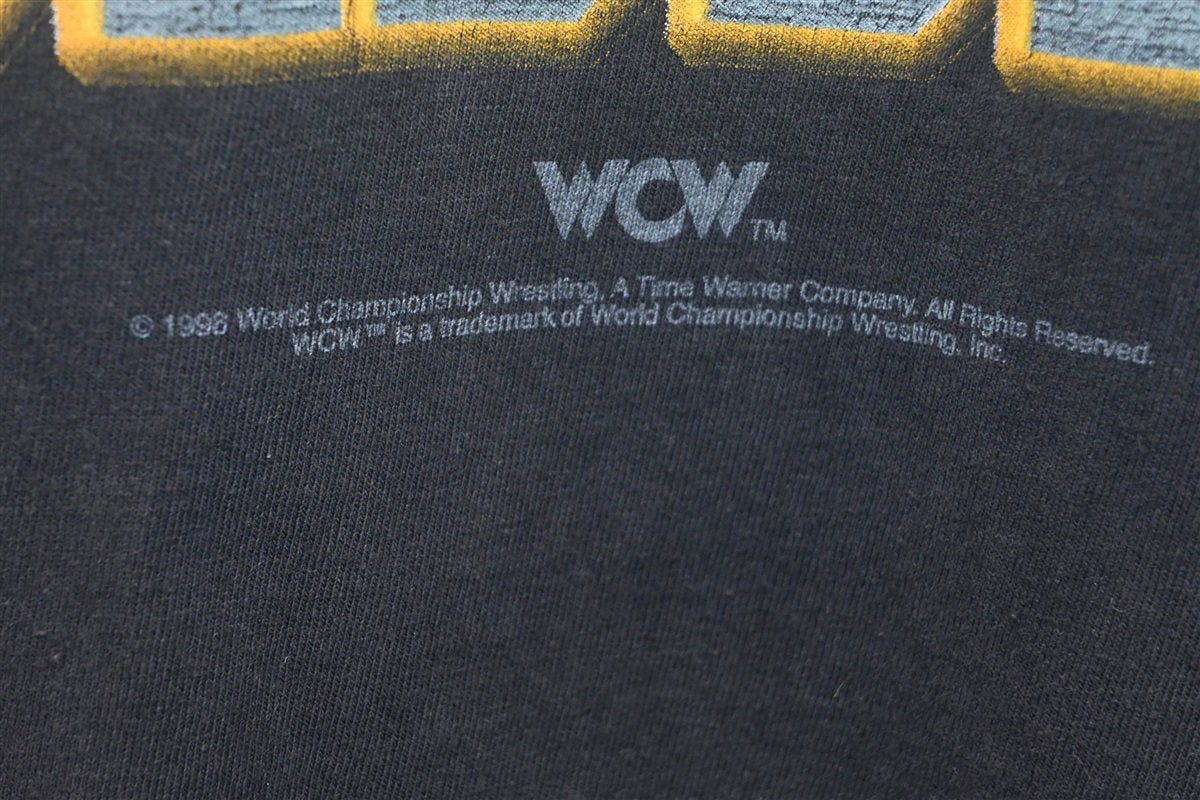 This cool tee reps the professional wrestler Bill Goldberg and it was made during his tenure with World Championship Wrestling. Goldberg had dreams of being a football star and he was briefly a part of the Atlanta Falcons and Carolina Panthers, before an injury derailed his NFL career. It was during his rehabilitation that Goldberg was persuaded by Lex Luger and Sting to pursue a career in pro wrestling instead.
