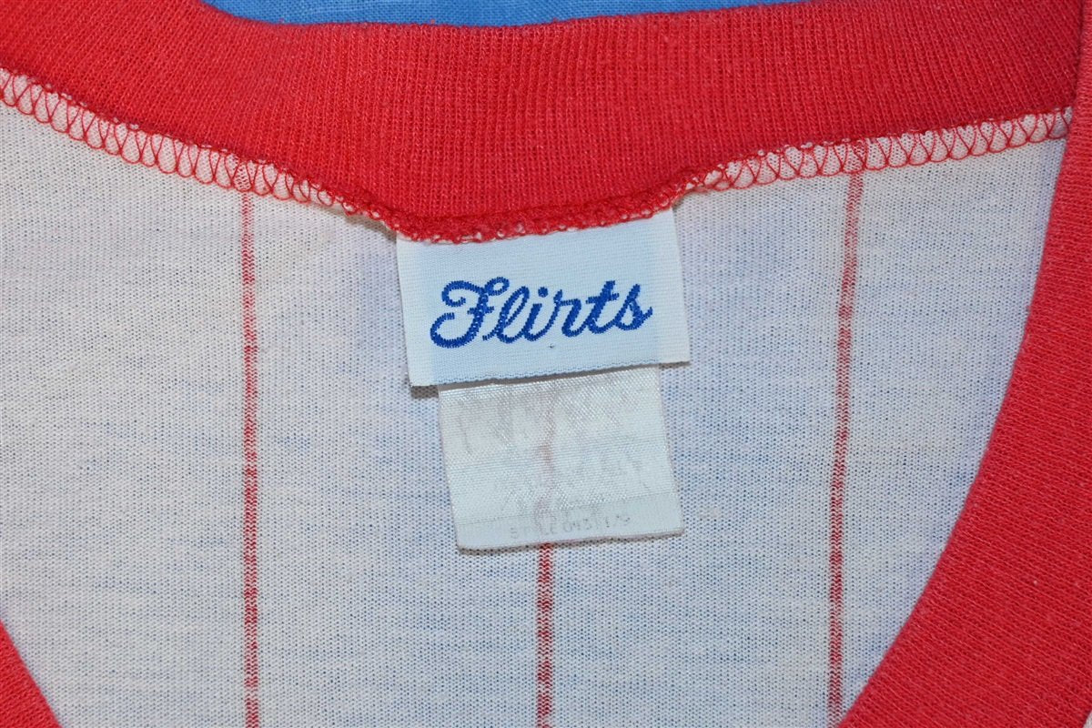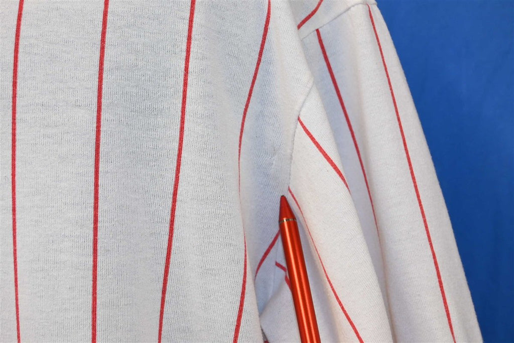 This awesome vintage sleep shirt promotes a fictional baseball team called the Bugs Bandits. The shirt features pinstripes meant to imitate a baseball uniform and it also sports a graphic of the beloved Looney Tunes character Bugs Bunny. Bugs was first conceived all the way back in the late 1930s by Warner Bros Cartoons, back when they were still under the name Leon Schlesinger Productions. Bugs is arguably the most famous of the Looney Tunes cast, having even earned his own star on the Hollywood Walk of Fame. This shirt was made back in the 90s, when the character was possibly best known for his role in the feature film Space Jam, where he appeared alongside real life NBA superstar Michael Jordan.