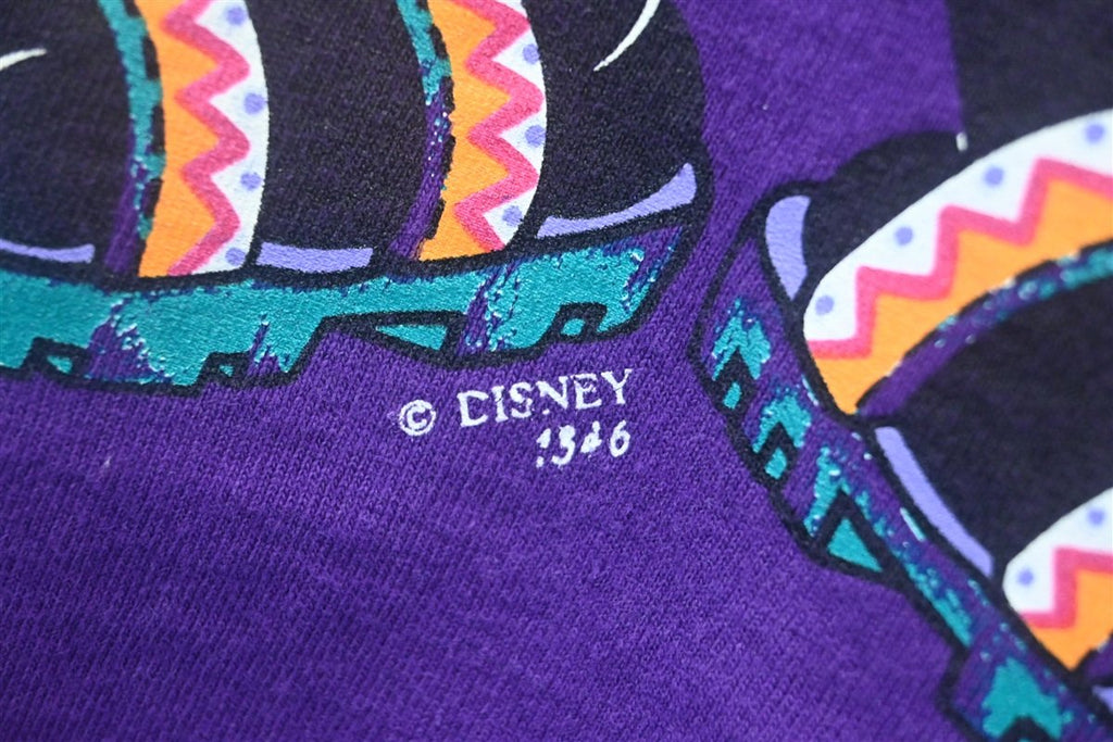 This sweet purple tee features the beloved Disney characters Mickey Mouse and his girlfriend Minnie. The shirt shows the couple dressed in tropical garb with the word Aloha, and the imagery is reminiscent of the theme of Disney's Polynesian Resort in Florida. The Disney World Resort was first opened in 1971, and surprisingly it was the location in which John Lennon signed the paperwork that officially ended the Beatles.
