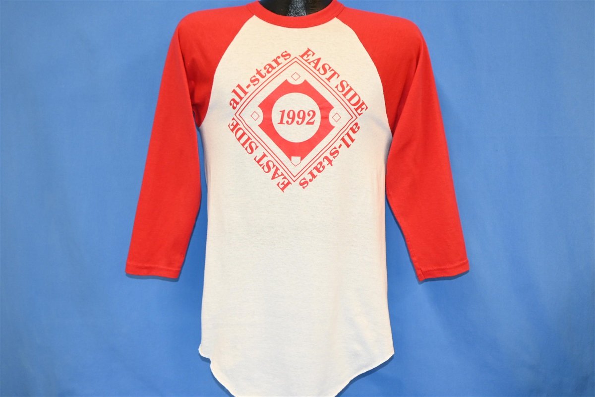 This classic raglan tee features a graphic from 1992 that looks to be for a sports team called the East Side All-Stars. This shirt was most likely made as the uniform for a local softball or baseball team, as raglan style shirts are commonly used as jerseys for those sports. This is because the angled seam makes it easier for athletes to raise and twist their arms.