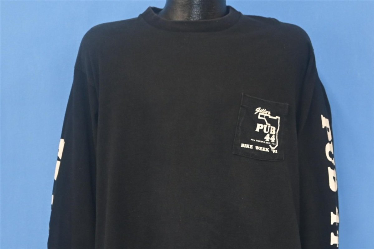 This sweet pocket t-shirt commemorates the 10th edition of the annual Bike Bash celebration at Gilly's Pub 44 in New Smyrna Beach, Florida. The Bash used to coincide with the nearby Daytona Bike Week festivities, and many Bike Week participants considered the bar to be an essential stop during the event. Named after its former owner, Gilly Aguiar, the establishment was an essential hangout for the local biker community for nearly 30 years, and it was even conveniently situated next to the New Smyrna Harley-Davidson dealership.