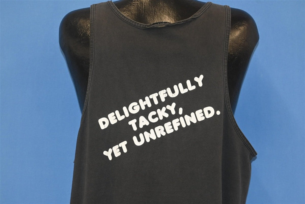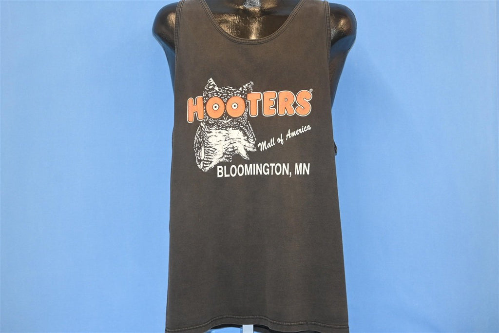 This vintage tank top promotes the infamous restaurant chain Hooters, and it features their owl logo and the slogan "delightfully tacky, yet unrefined".  This particular tank is a souvenir from the location inside the Mall of America in Bloomington, Minnesota. The first ever Hooters was opened in Clearwater, Florida in 1983 and the Mall of America Hooters has been serving customers for nearly just as long. While the company boasts cold draft beer and delicious crispy wings, it's perhaps best known for the wait staff. Since its inception, the restaurant has used beautiful scantily clad waitresses as one of their primary selling points.