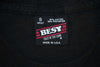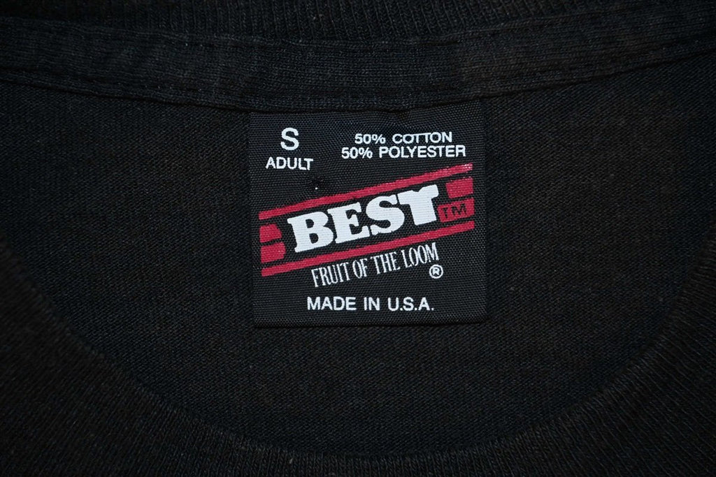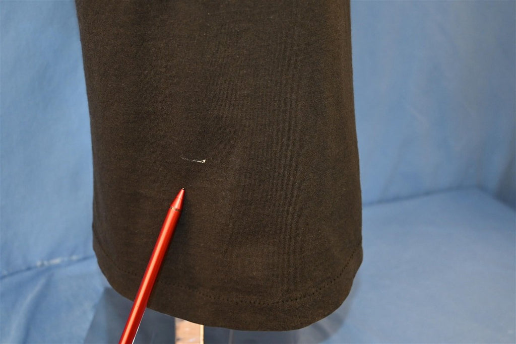 Fits like a modern unisex adult small. There is a spot on the back right side when wearing, see pics. The white in the graphic is puffy paint.