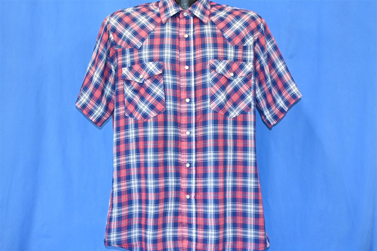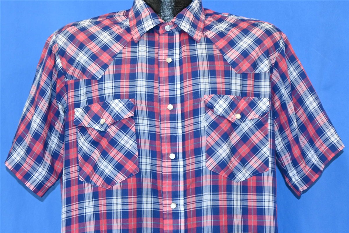 This vintage western shirt was made by the popular apparel brand Levi's and it features the classic Levi's white tab tag attached to the chest pocket. The chest pockets also have flaps that match the western style yokes on the front and back of the shirt. This shirt comes decked out in a stylish red, white, and blue plaid pattern and has pearl snap closures.