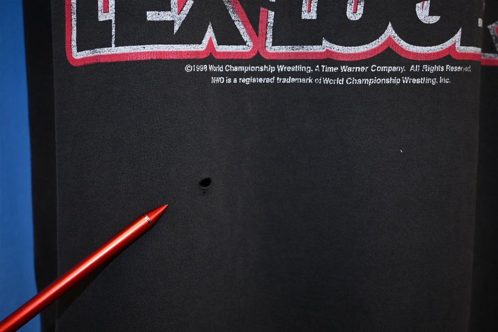 This sweet wrestling shirt was made for the popular WCW stable the New World Order. More specifically, this shirt highlights nWo member, Lex Luger, and it refers to him as "The Total Package". This shirt was made in the late 90s, after nWo was broken into two smaller factions. Luger was a part of the nWo Wolfpac lead by Kevin Nash, and he was also a part of nWo Elite, who also sported the red and black logo that was originally used for Wolfpac.