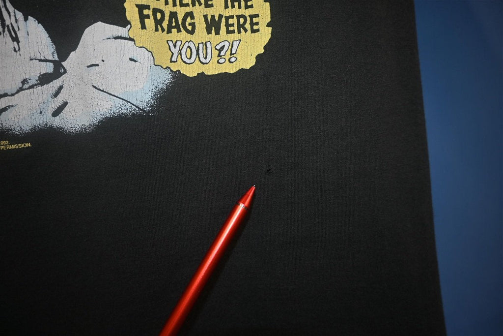 This amazing shirt is a souvenir from the 1992 edition of San Diego Comic Con. The shirt says, "I kicked butt at San Diego Comic Con" and it features a graphic of the awesome fictional bounty hunter, Lobo asking, "where the frag were you?" The early 90s marked the peak of Lobo's popularity as comic fans went crazy over the character's edgy biker-inspired redesign. The character's new image was largely thanks to Simon Bisley, who was contacted by Alan Grant and Keith Giffen to give Lobo a visual and conceptual revamp.