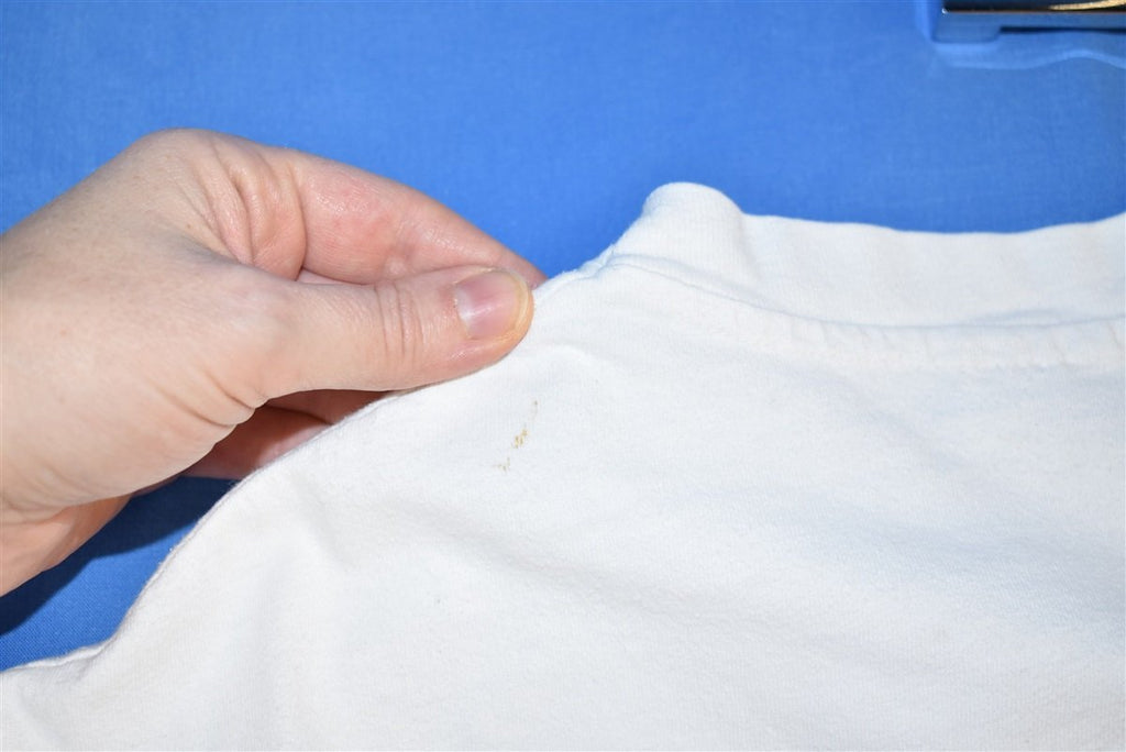 Fits like a modern unisex adult large. There is a spot on the back left shoulder, see pics.