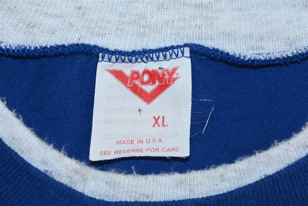 This cool tee has gray roll up sleeves, and it was made to promote the footwear brand, Pony. Based in New York City, Pony was founded in 1972 and by the start of the 80s and they had grown into one of the top athletic brands in the world. Over the years the company has sponsored athletes in pretty much every major sport. They have a particularly strong history with boxers, and they even sponsored Buster Douglas the night he beat, the then-undefeated heavyweight champ, Mike Tyson.