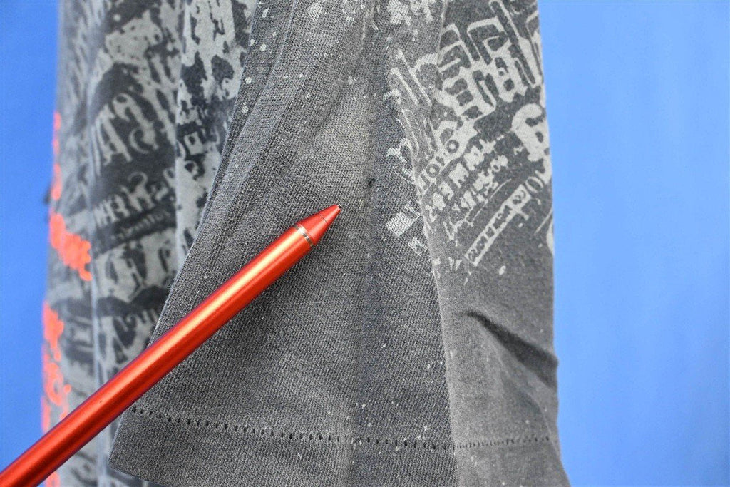 Fits like a modern unisex adult oversized Extra Large. There is a spot near the collar on the front, and holes on the front and sleeve, see pics.